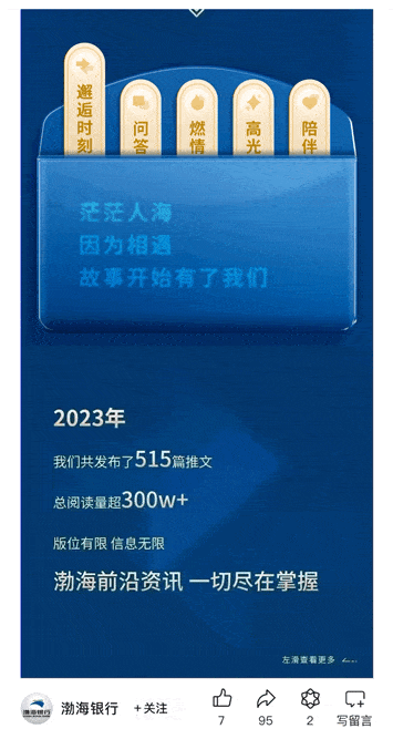 這篇年終總結(jié)推文呈現(xiàn)的內(nèi)容豐富,帶用戶回顧了該公眾號的年度亮點以及企業(yè)的榮耀時刻。本文共包含五個主體部分,這些部分采用了新穎的抽標(biāo)簽的形式進(jìn)行展示,讓用戶可以重復(fù)點擊不同標(biāo)簽,并通過滑動的操作瀏覽該主題下的具體內(nèi)容。