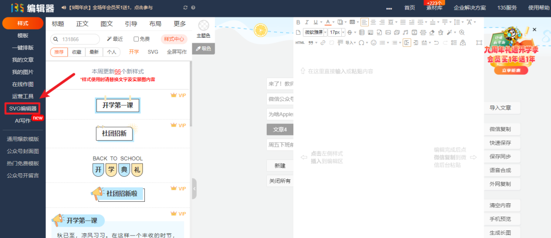 在135編輯器左側(cè)找到SVG編輯器入口,點擊進入SVG編輯器頁面。