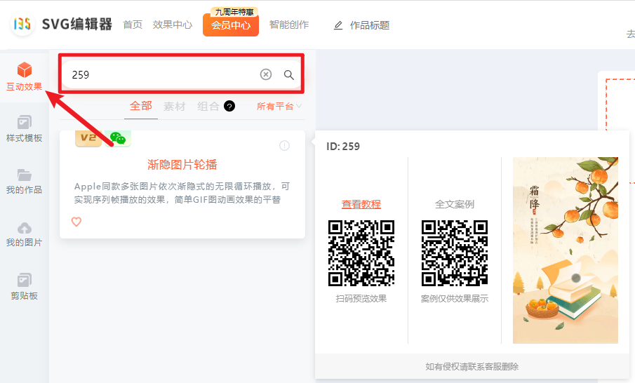 進入SVG編輯頁面后,選中[互動效果]在搜索框中輸入組件ID:259,查找到組件漸隱圖片輪播。