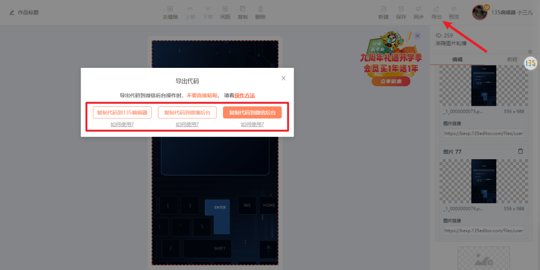 在完成所有圖片的上傳后,我們就可以選擇導(dǎo)出,復(fù)制到135編輯器或是微信后臺。