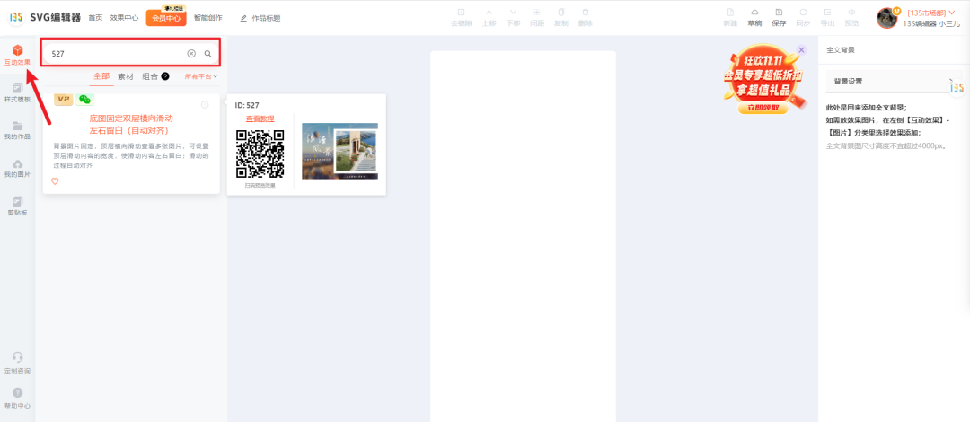 進(jìn)入SVG編輯器后,選中互動效果在搜索框中輸入組件ID:527