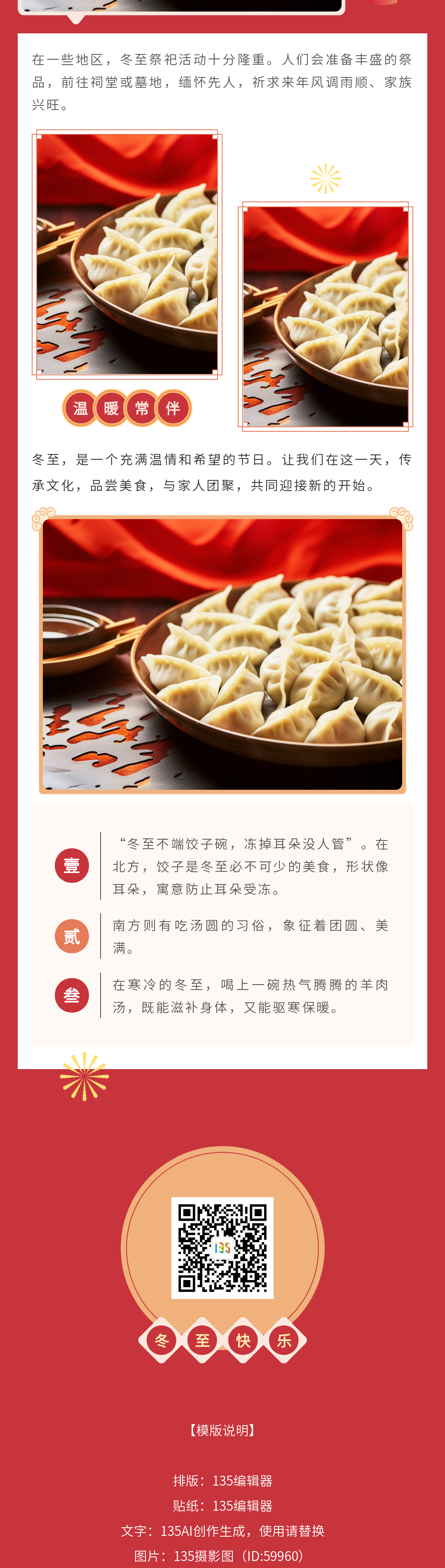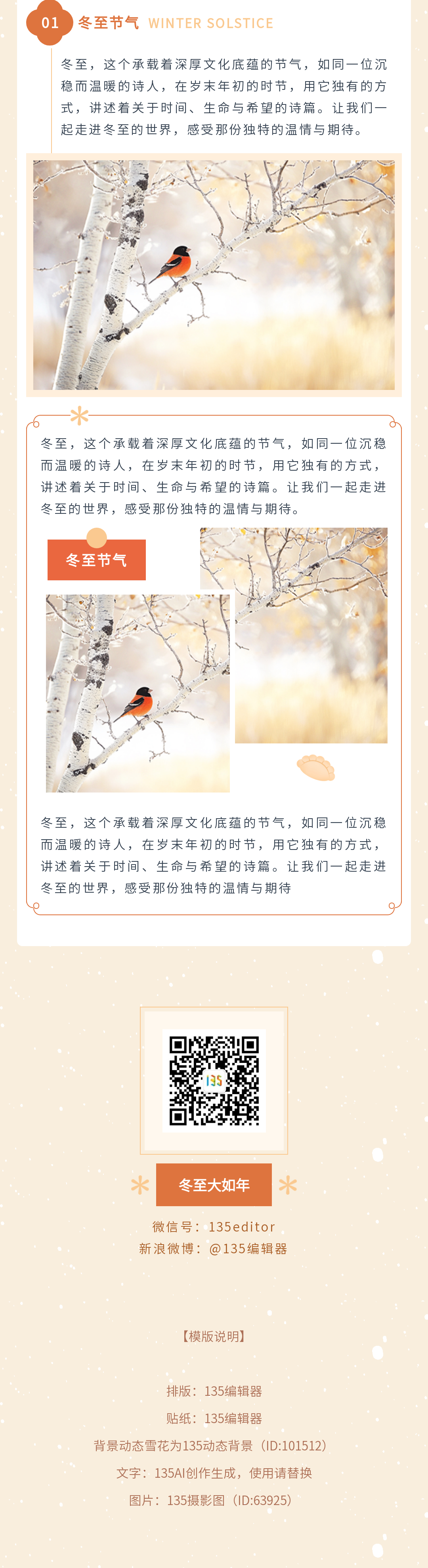 冬至來臨,為您的公眾號帶來溫暖的節(jié)日氛圍。135編輯器特別推出冬至主題模板,讓您的內容更具節(jié)日特色。精選模板ID,一鍵搜索,快速應用,讓讀者在歲末寒冬中感受溫馨。