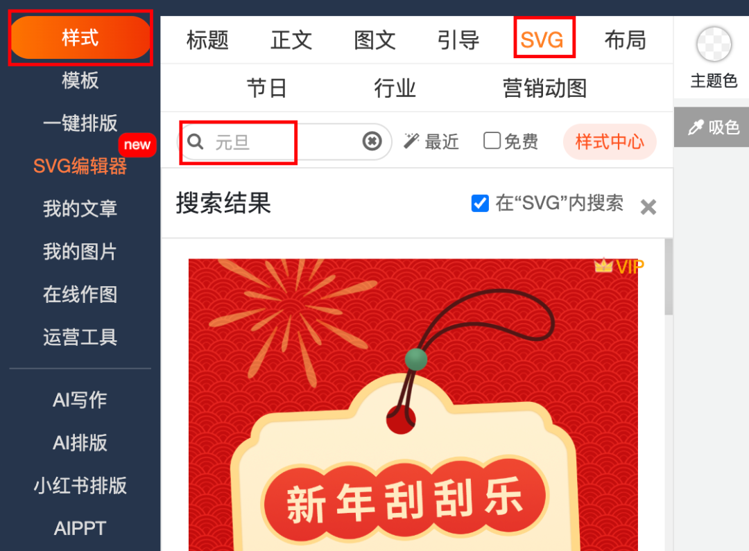首先在編輯器界面左側(cè)選擇【樣式】——【SVG】,搜索【元旦】關(guān)鍵詞,即可查看。