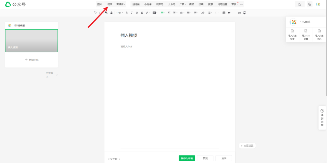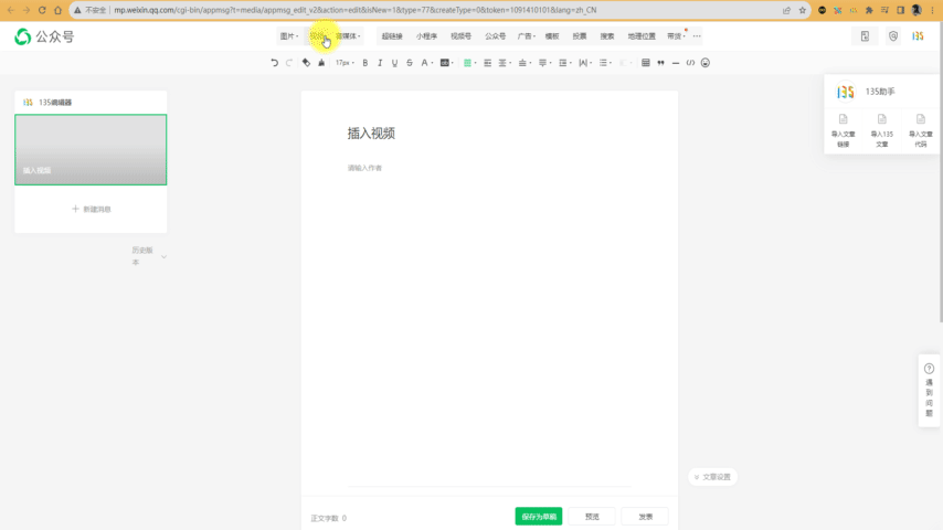 首先,在135編輯器頂部菜單欄找到【視頻】選項(xiàng),并將騰訊視頻鏈接粘貼于此。請(qǐng)注意,在編輯器中視頻不會(huì)播放,顯示為黑屏。您需要將視頻保存并同步到微信公眾號(hào)后臺(tái),通過(guò)手機(jī)預(yù)覽來(lái)查看視頻內(nèi)容。