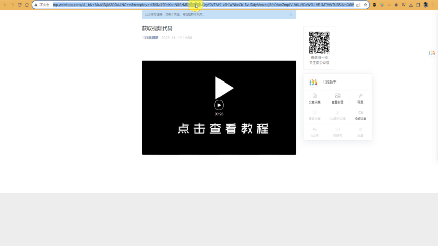 在微信后臺(tái)保存一篇含有視頻的推文草稿,然后在草稿箱中找到該文章,復(fù)制預(yù)覽鏈接網(wǎng)址。返回SVG編輯器頁(yè)面,點(diǎn)擊【快速獲取代碼】,粘貼鏈接以獲取視頻代碼。完成后,選擇【導(dǎo)出】,將內(nèi)容導(dǎo)出到135編輯器或微信公眾號(hào)后臺(tái)。