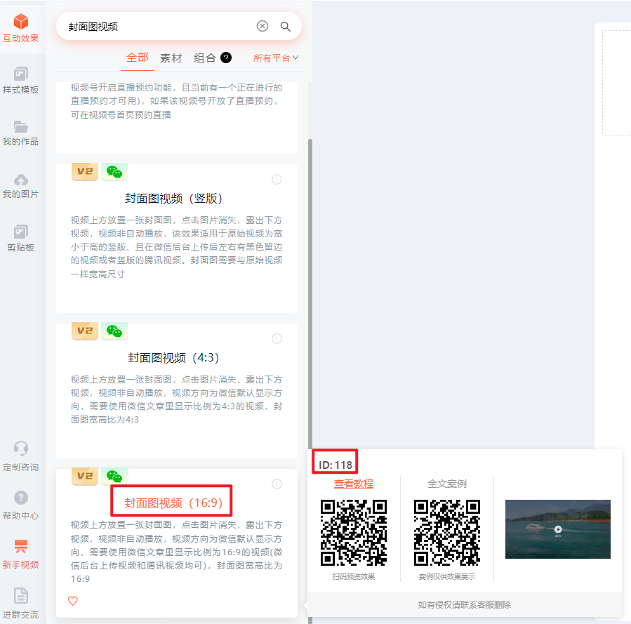 為了實(shí)現(xiàn)文章的一體性,有時(shí)需要自定義視頻封面。在135編輯器左側(cè)菜單欄找到SVG編輯器,輸入ID:118(封面圖視頻16:9)來(lái)選擇合適的SVG效果組件。