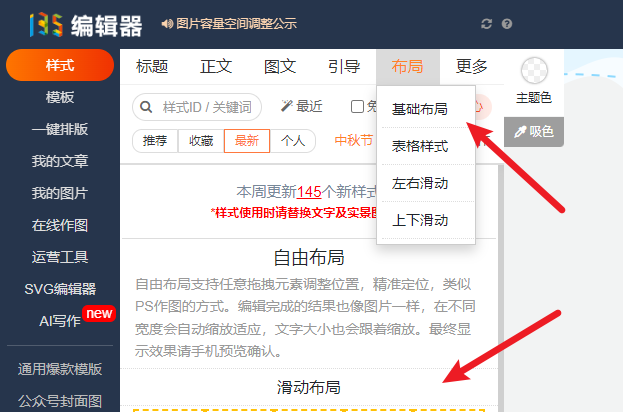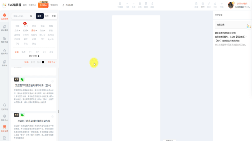 首先,打開你的135編輯器。在編輯器頁面左側(cè),找到[樣式]選項。在頂部的SVG分類中,選擇[滑動],這里匯集了各種滑動樣式供你選擇。
