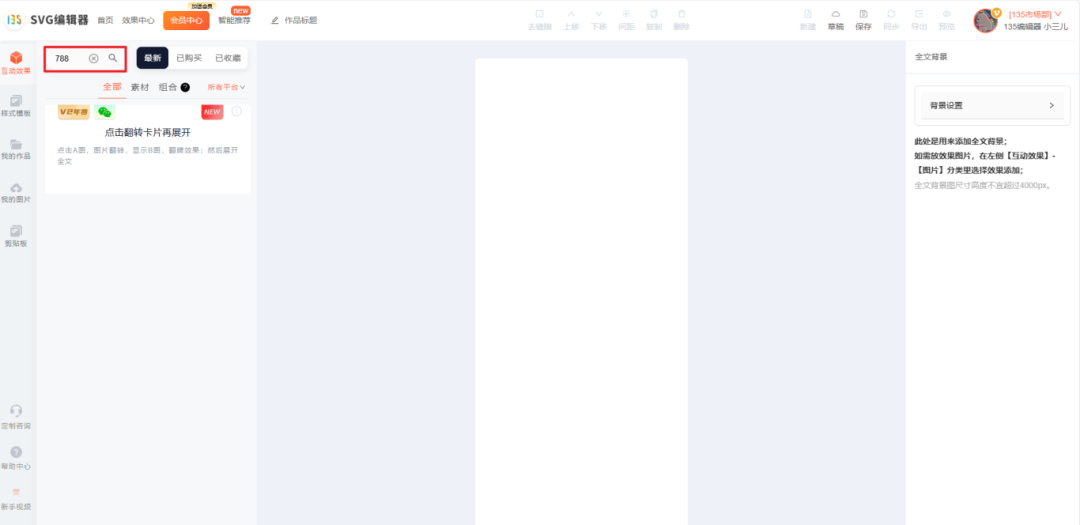 打開135編輯器,找到并點(diǎn)擊「SVG編輯器」按鈕,進(jìn)入SVG編輯器頁(yè)面。這里是你實(shí)現(xiàn)點(diǎn)擊翻轉(zhuǎn)效果的主要工作區(qū)域。