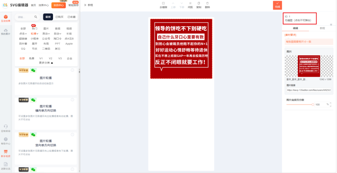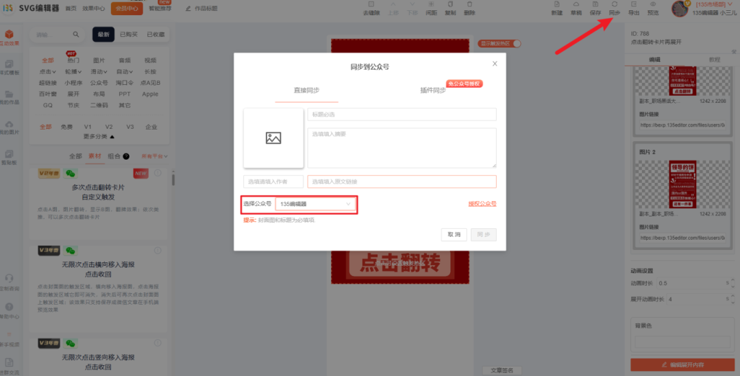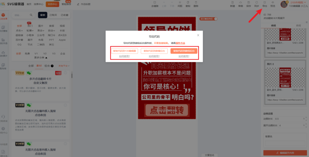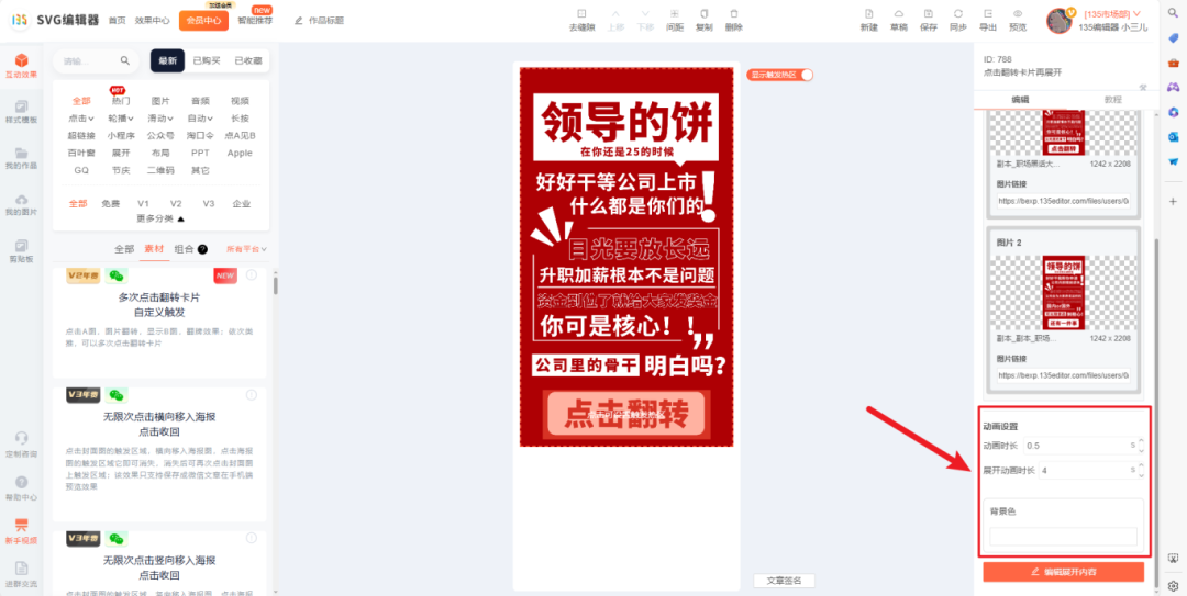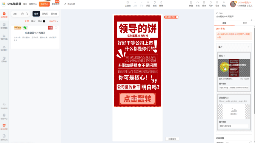 選擇合適的編輯器:確保你使用的編輯器支持SVG編輯和點(diǎn)擊翻轉(zhuǎn)效果的實(shí)現(xiàn)。135編輯器是一個(gè)不錯(cuò)的選擇,它提供了豐富的組件和功能,方便我們進(jìn)行操作。