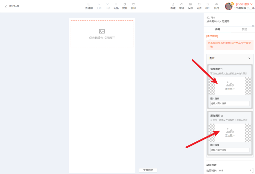 在編輯頁(yè)面的右側(cè),找到素材上傳區(qū)域。按照編輯器的要求,上傳你準(zhǔn)備好的圖片素材。一般情況下,你需要上傳兩張圖片:一張用于展示翻轉(zhuǎn)前的內(nèi)容,另一張用于展示翻轉(zhuǎn)后的內(nèi)容。