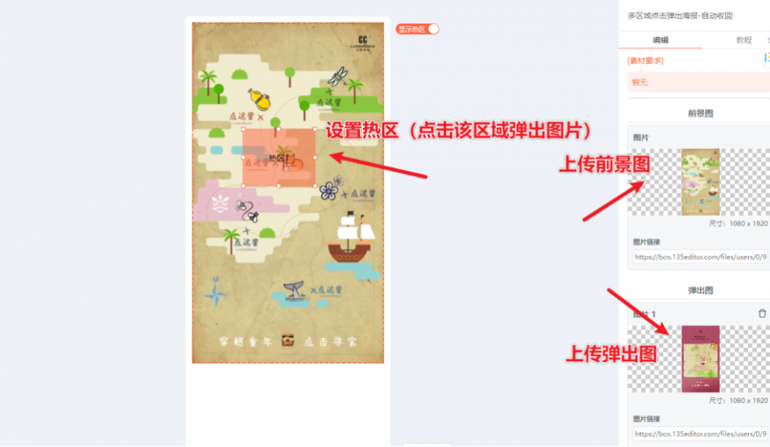 在編輯器中,上傳你的前景圖,即藏寶圖的主圖。這張圖上會展示多個可點擊的區(qū)域,如地標(biāo)、圖標(biāo)等。