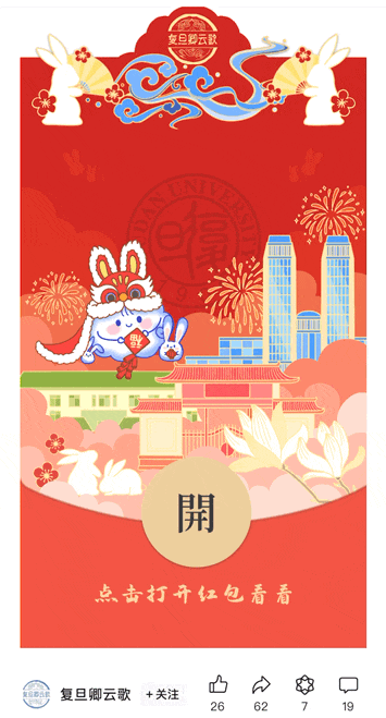 這是來自復(fù)旦卿云歌的新年主題推文,他們在此文章中采用了很新穎的紅包玩法,即通過模擬開紅包的視覺效果來呈現(xiàn)文章內(nèi)容。當(dāng)用戶點(diǎn)擊開篇的紅包封面后,文章內(nèi)容就會伴隨著開紅包的動效展開,給用戶帶來一種沉浸式的閱讀體驗(yàn)。這種放在推文開篇的動效玩法,能有效吸引用戶注意力,從而提高推文打開率。