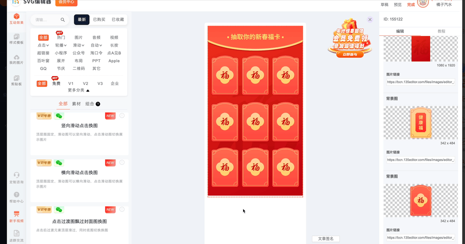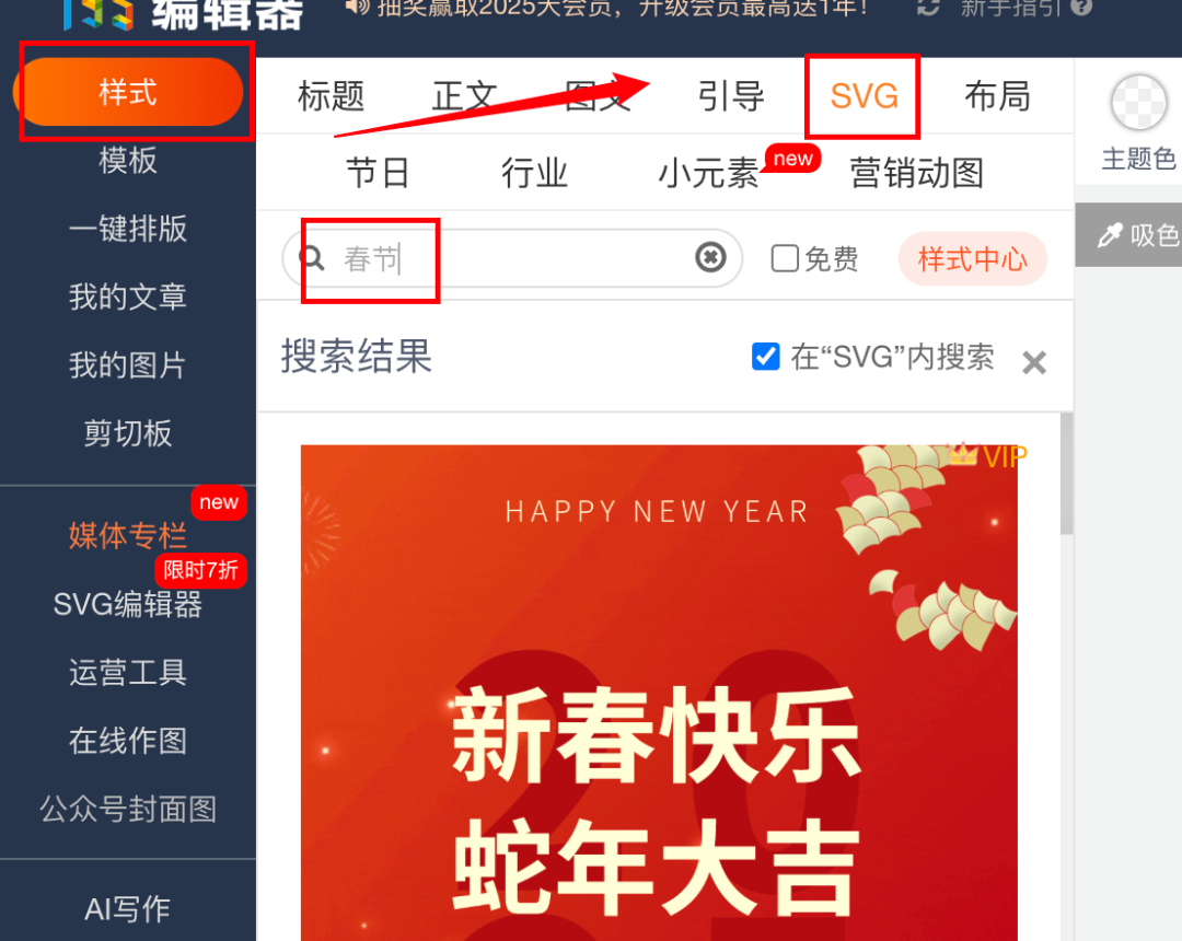首先在編輯器界面左側(cè)選擇【樣式】——【SVG】,搜索【春節(jié)】關(guān)鍵詞,即可查看。