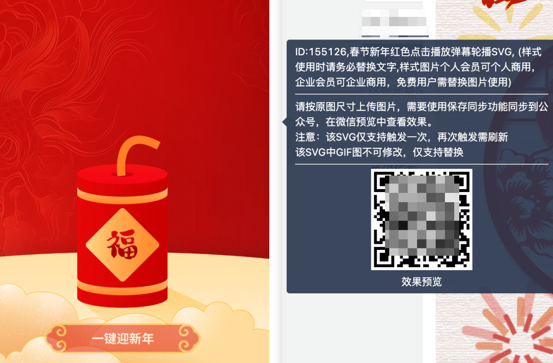 將鼠標(biāo)輕放在樣式上,會(huì)出現(xiàn)瀏覽的二維碼,用手機(jī)微信掃碼,即可直觀感受此款SVG玩法。