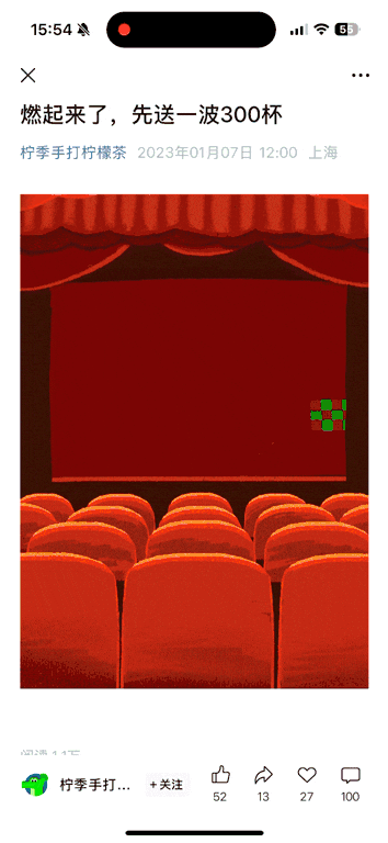 檸季手打檸檬茶,利用多次點(diǎn)擊換圖展開,模擬新春觀影,展開內(nèi)容是營銷宣傳活動(dòng),展開內(nèi)容中再嵌套一個(gè)帶連接的點(diǎn)擊換圖,能夠在互動(dòng)中巧妙地引導(dǎo)用戶到自己的商品頁中,實(shí)現(xiàn)轉(zhuǎn)化。