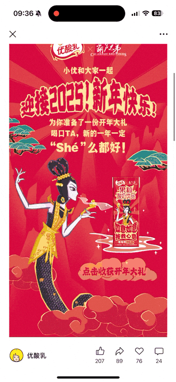 優(yōu)酸乳巧妙將產(chǎn)品融入進(jìn)畫面中,每點(diǎn)擊一次畫面就伸展一次,場景也隨之變化,變化的是場景不變的是產(chǎn)品,更能凸顯產(chǎn)品力,趣味、互動(dòng)性也更強(qiáng)。