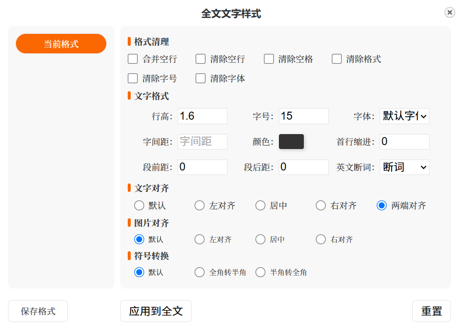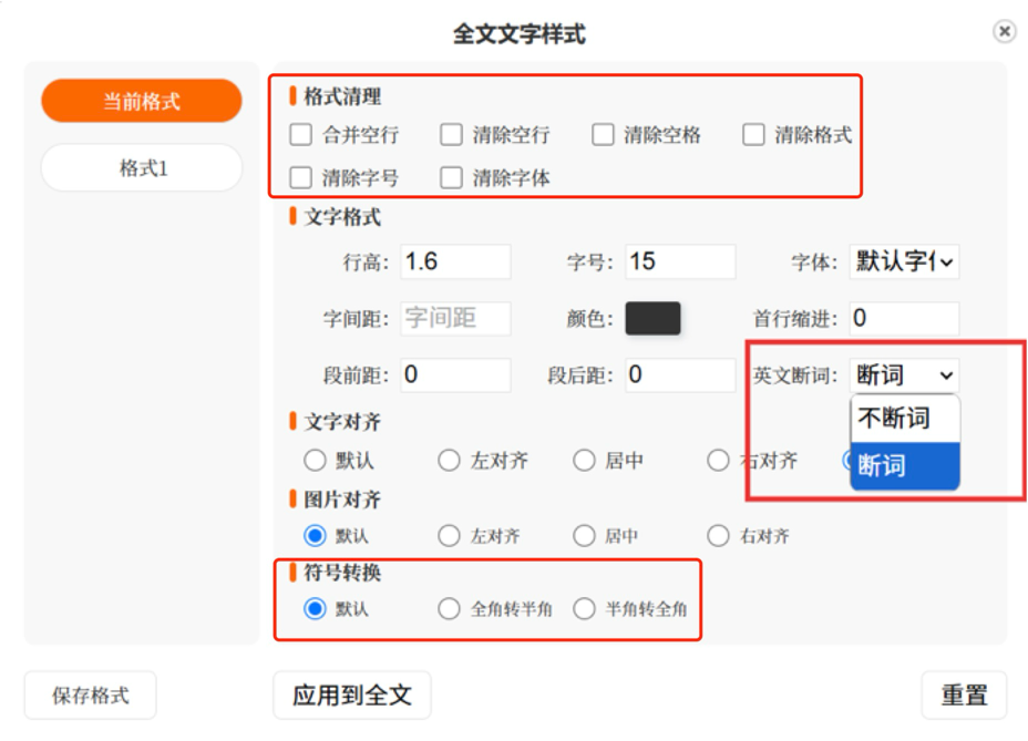 包括我們的英文單詞、對齊方式也相對于舊版更加方便,這次也新增了格式清理和符號轉換功能。