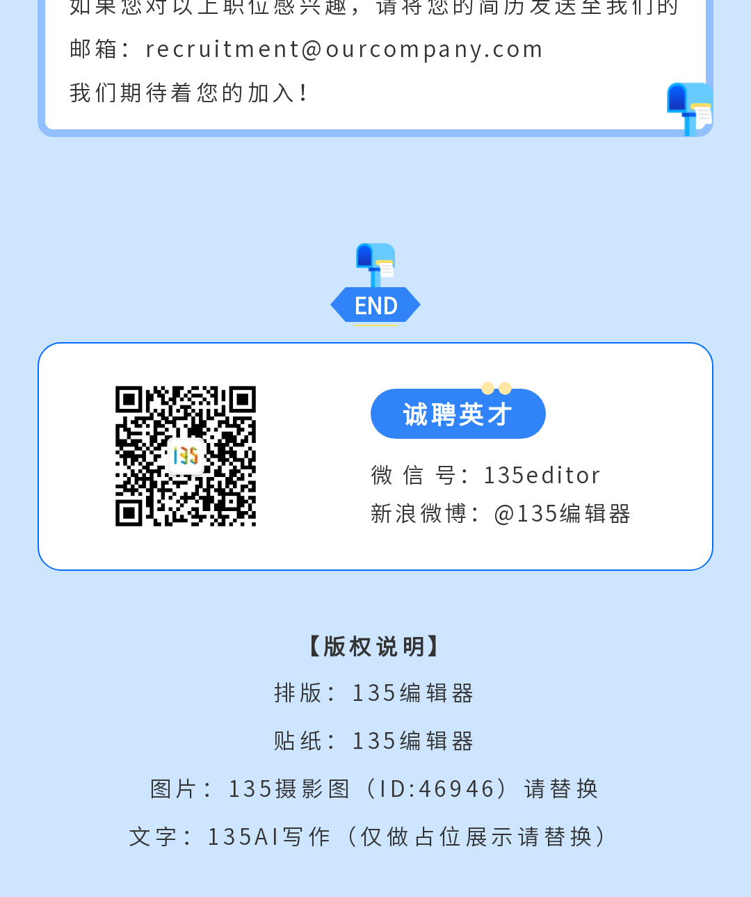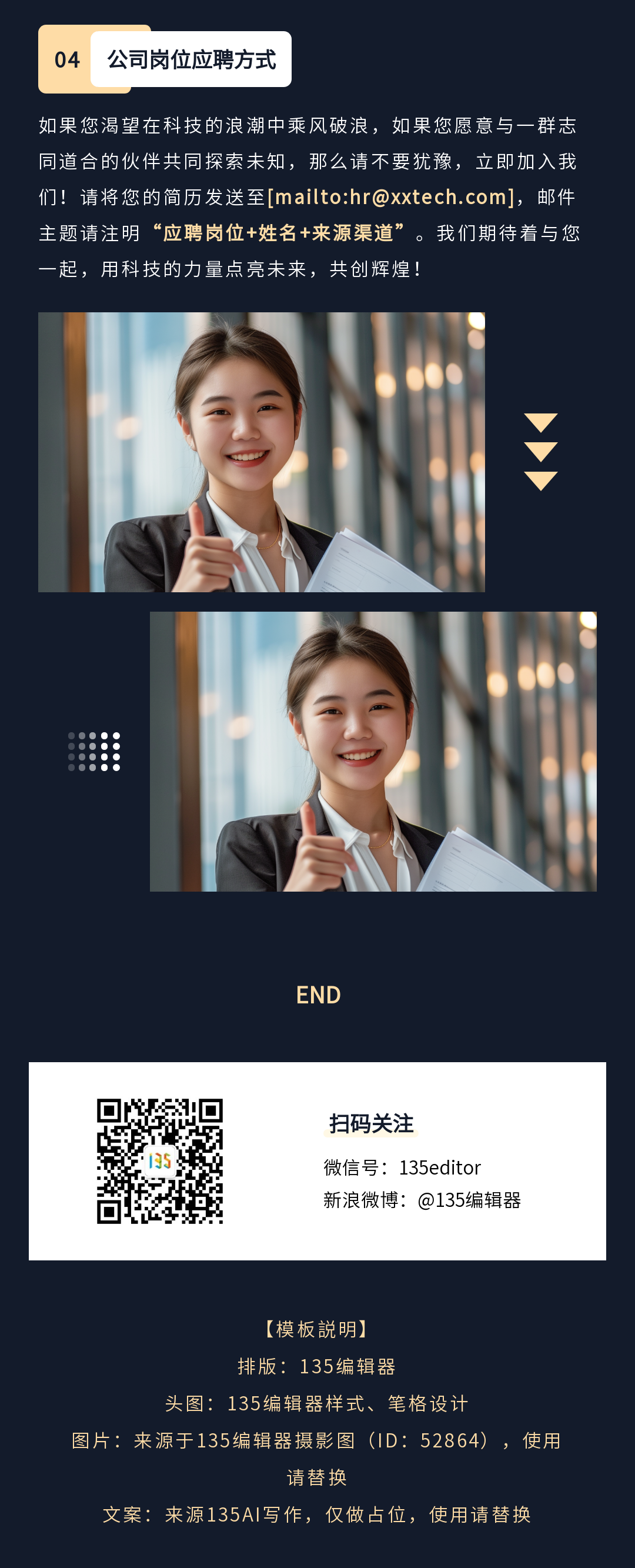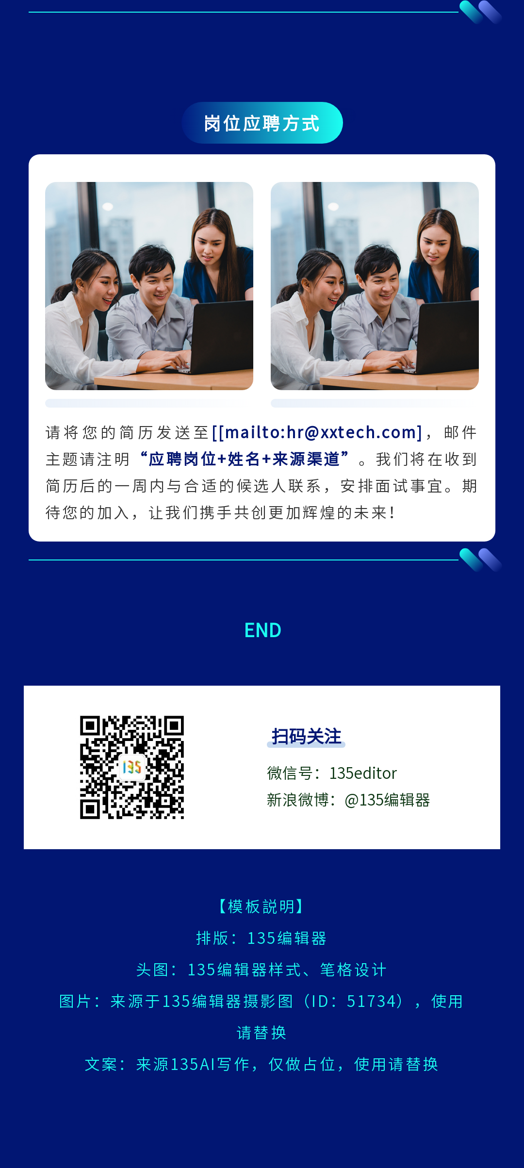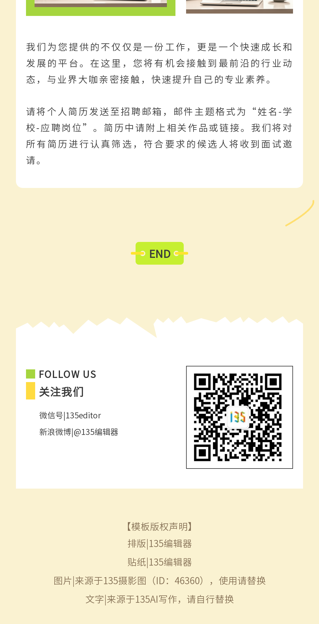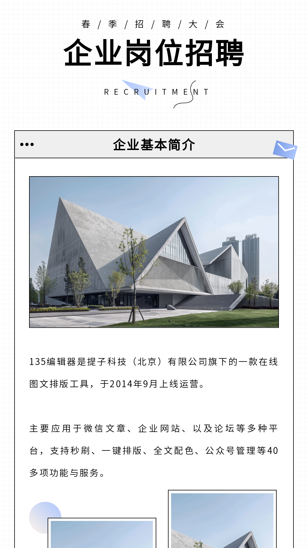 【2025春招季】135編輯器提供政務(wù)、科技、教育等7大行業(yè)招聘推文模板,含模板ID一鍵套用!HR快速提升招聘宣傳效果,海量簡歷輕松獲取。免費下載各行業(yè)公眾號招聘模板,助力企業(yè)高效招人!