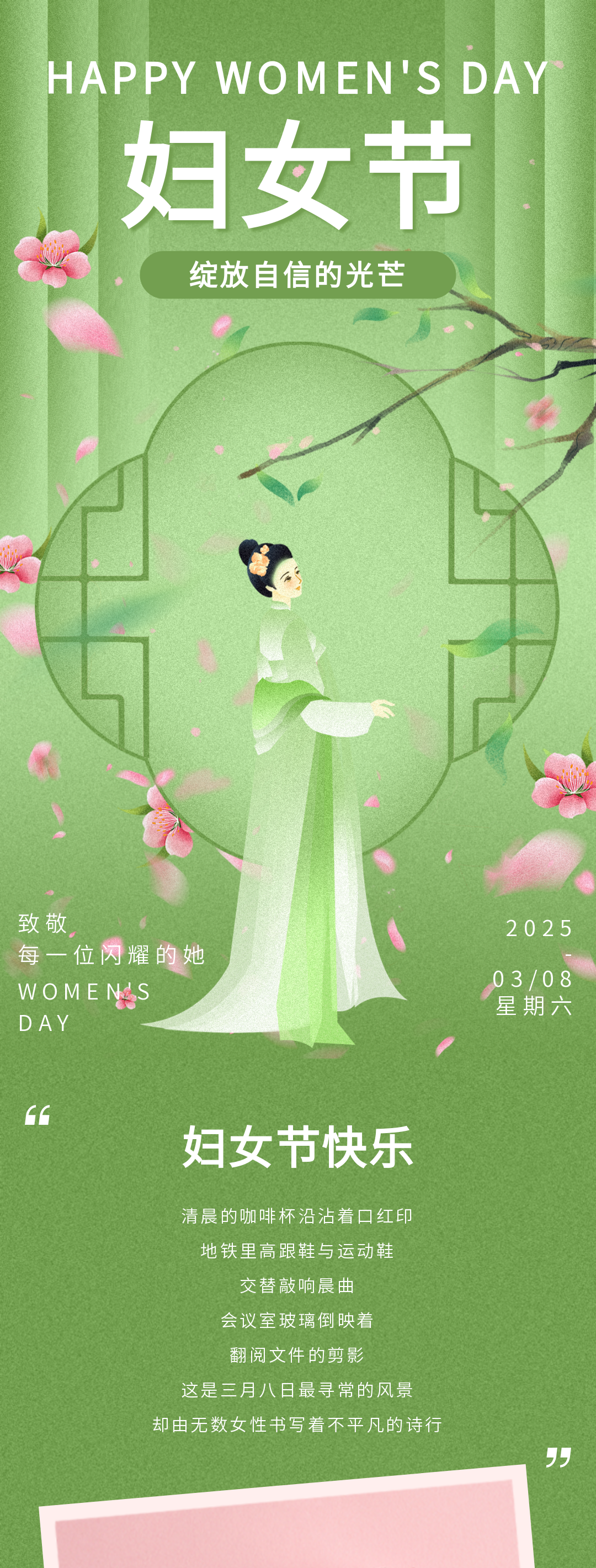每一個(gè)“她”,都擁有獨(dú)一無二的光芒,都值得被看見、被尊重、被贊美。婦女節(jié)將至,三兒已經(jīng)為大家準(zhǔn)備好了婦女節(jié)可用的模板素材,讓我們用文字傳遞祝福,致敬每一個(gè)“她”!