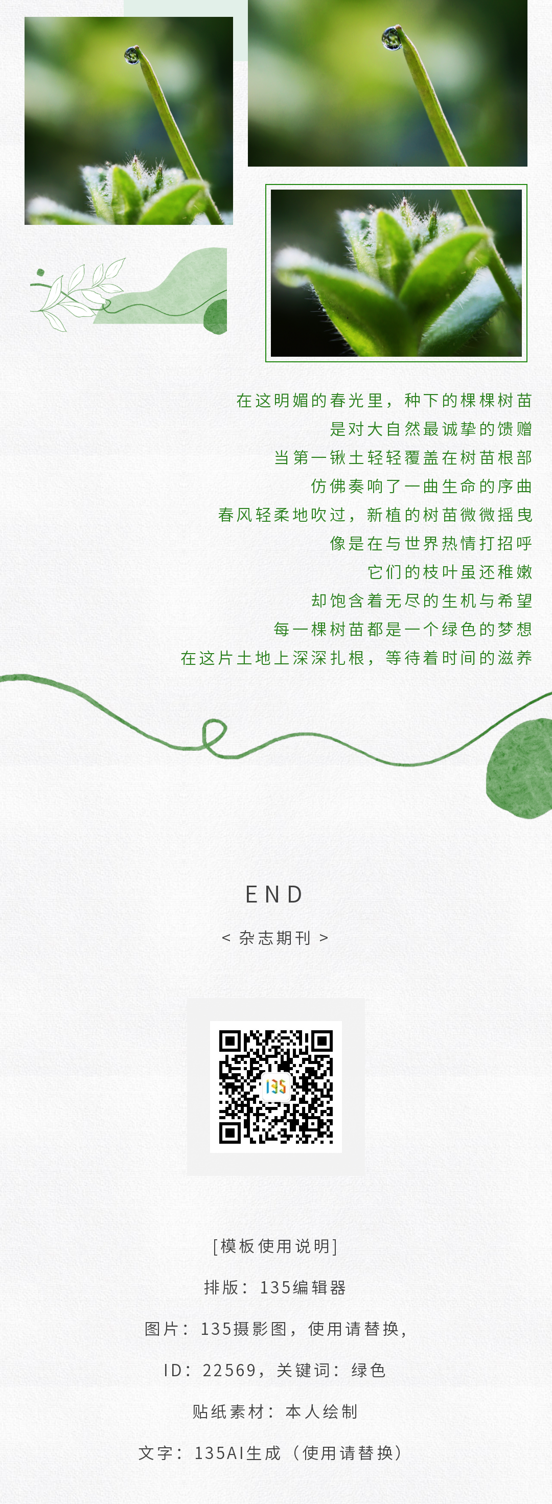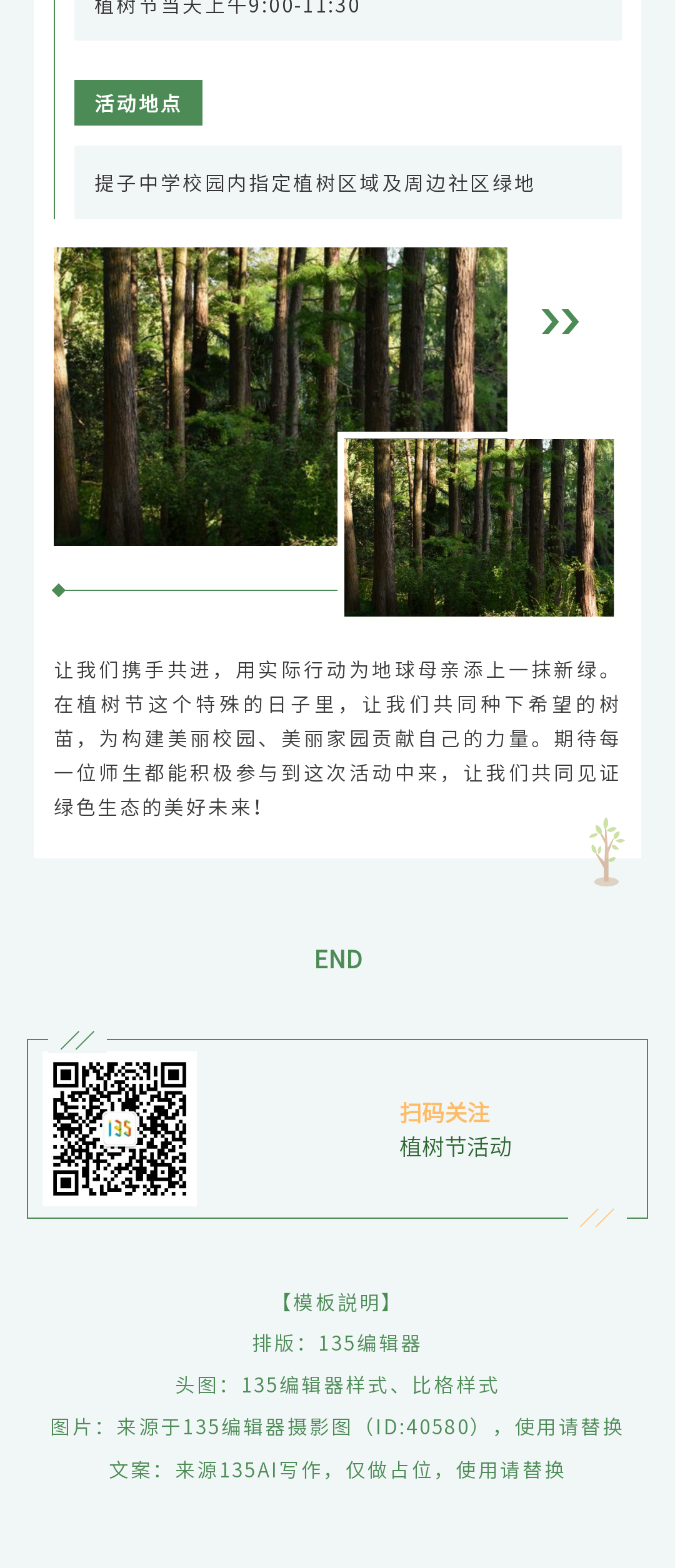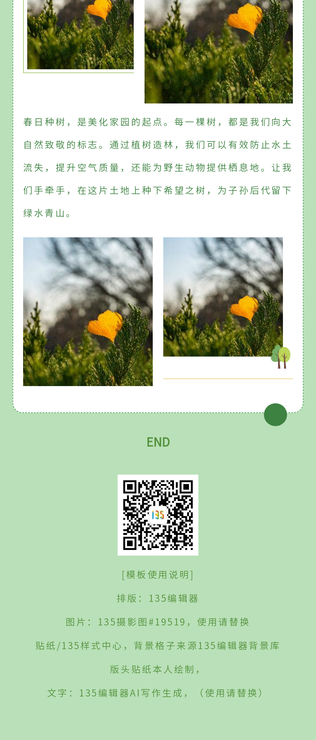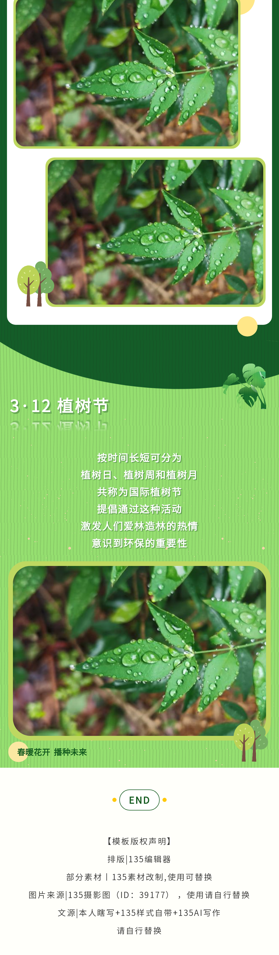 【135編輯器】提供2025最新植樹節(jié)公眾號模板、海報設(shè)計素材及公眾號樣式合集,包含漸隱圖片輪播、春日植樹計劃等創(chuàng)意模板下載。輸入模板或樣式ID快速調(diào)用。立即獲取植樹節(jié)專屬設(shè)計素材,助力綠色宣傳!