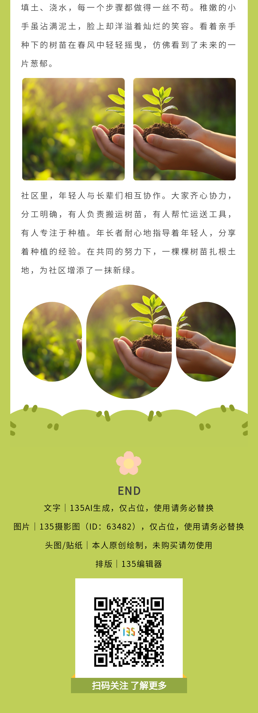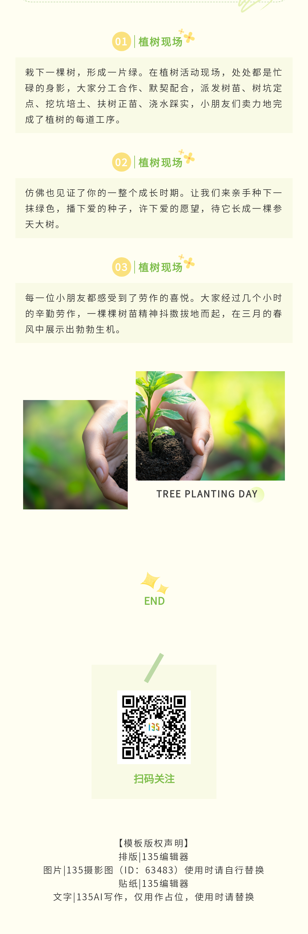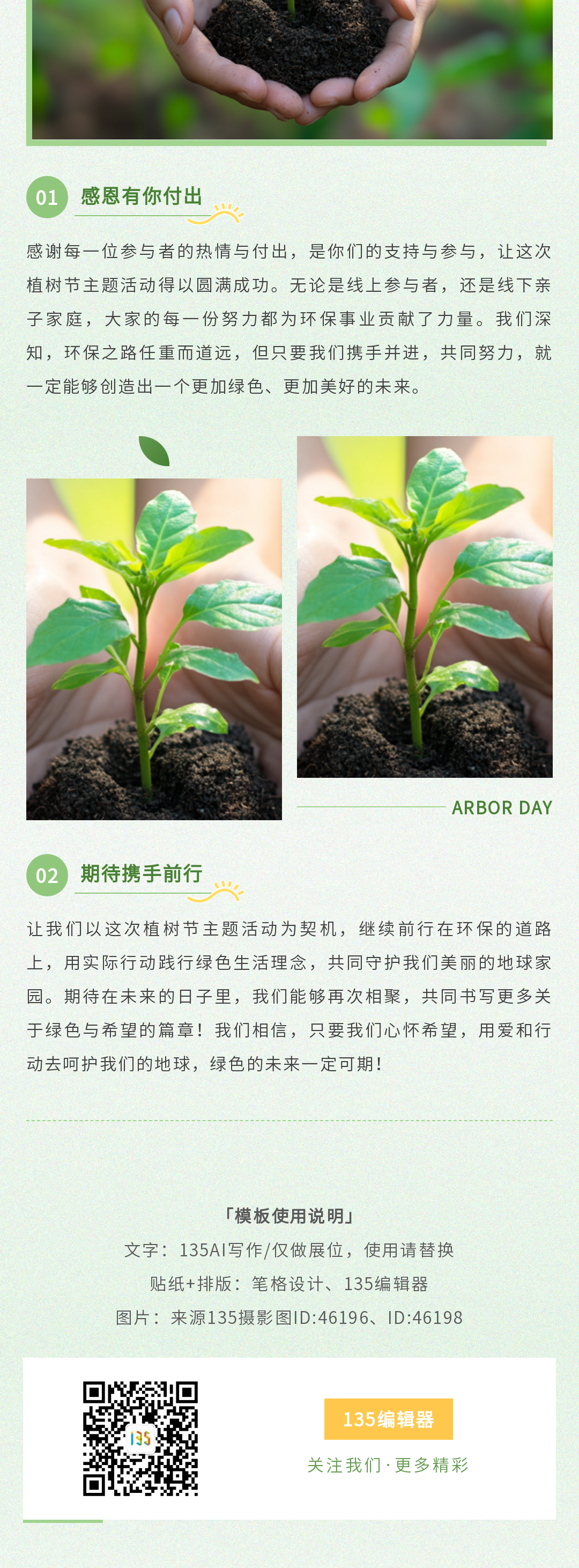 【135編輯器】提供2025最新植樹節(jié)公眾號模板、海報設(shè)計素材及公眾號樣式合集,包含漸隱圖片輪播、春日植樹計劃等創(chuàng)意模板下載。輸入模板或樣式ID快速調(diào)用。立即獲取植樹節(jié)專屬設(shè)計素材,助力綠色宣傳!