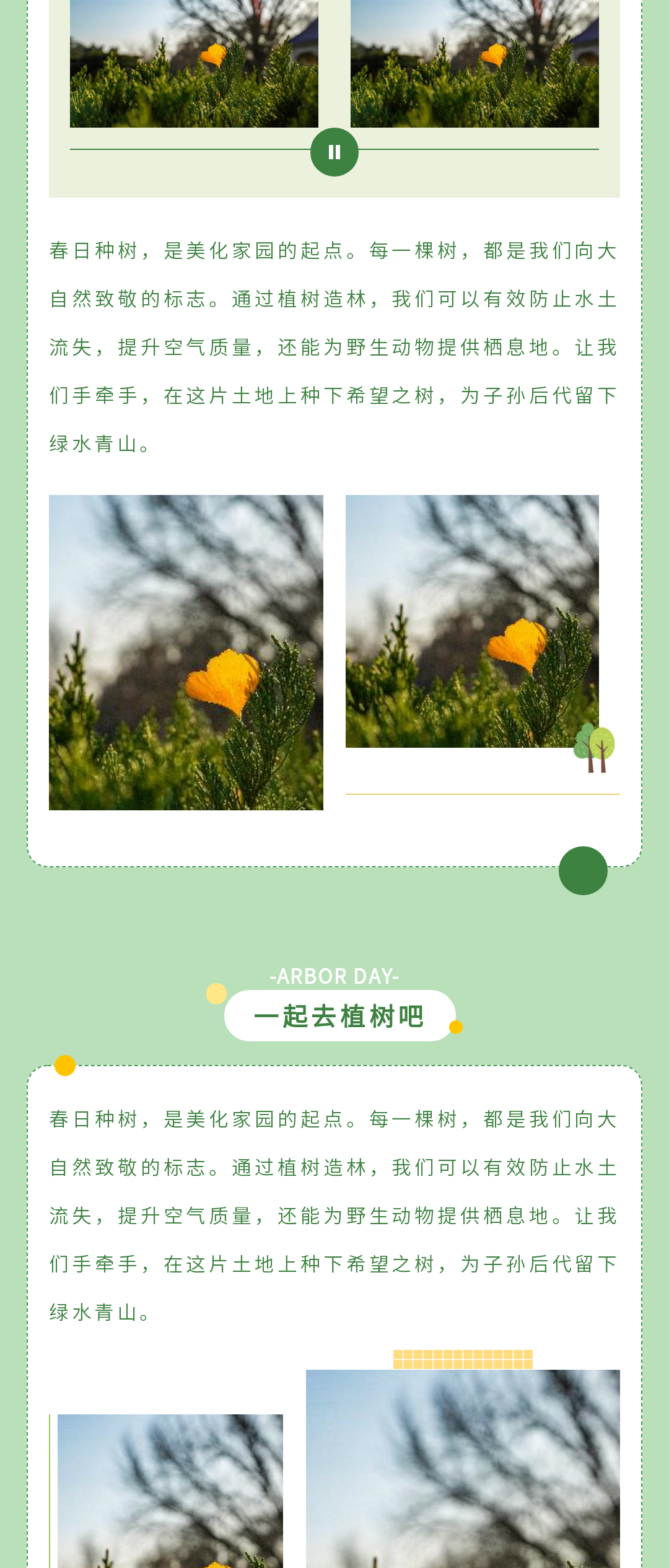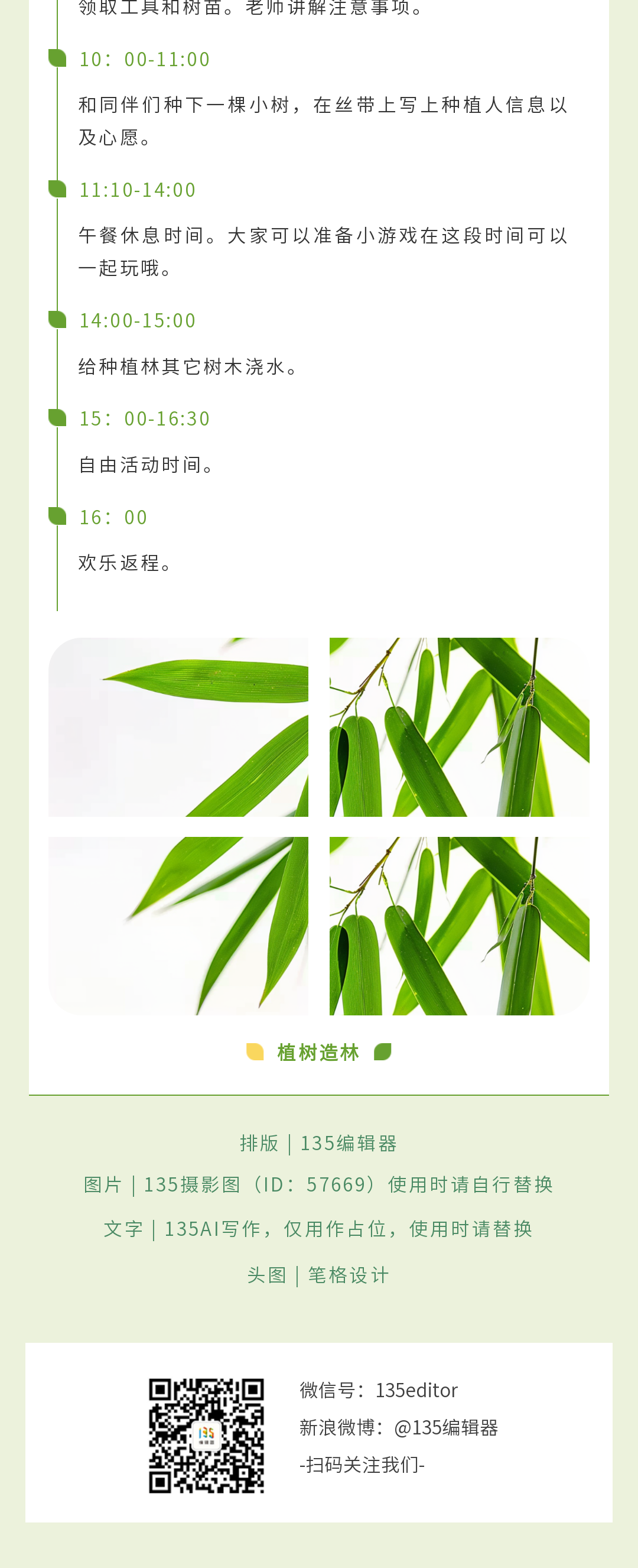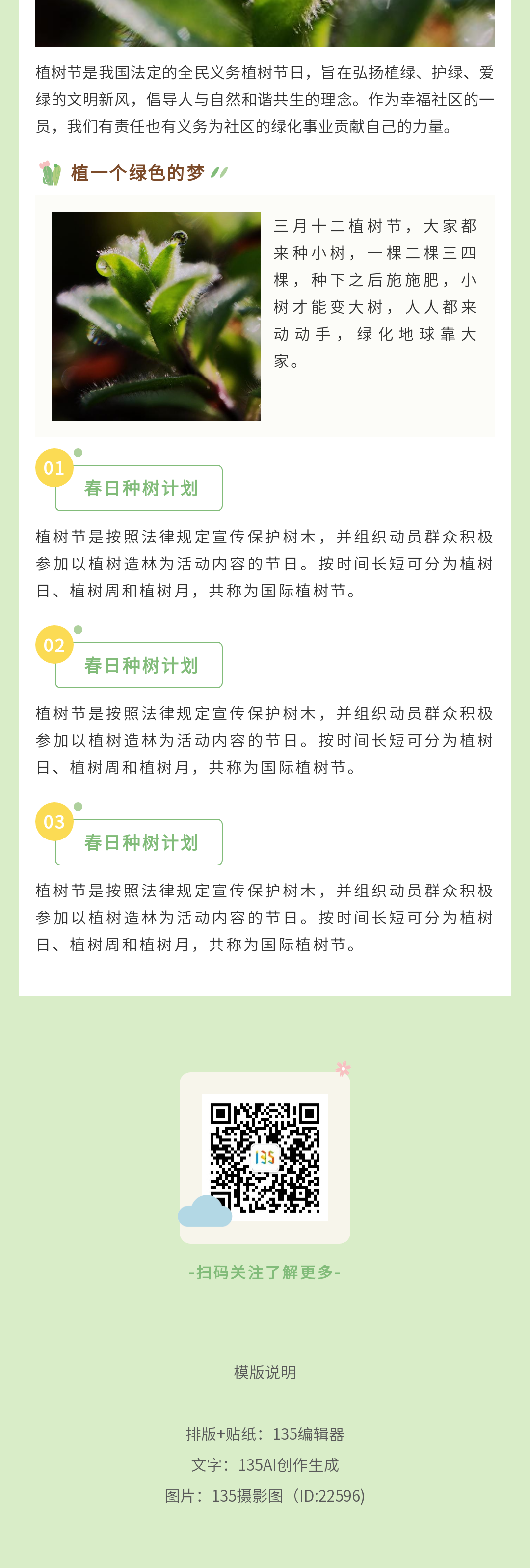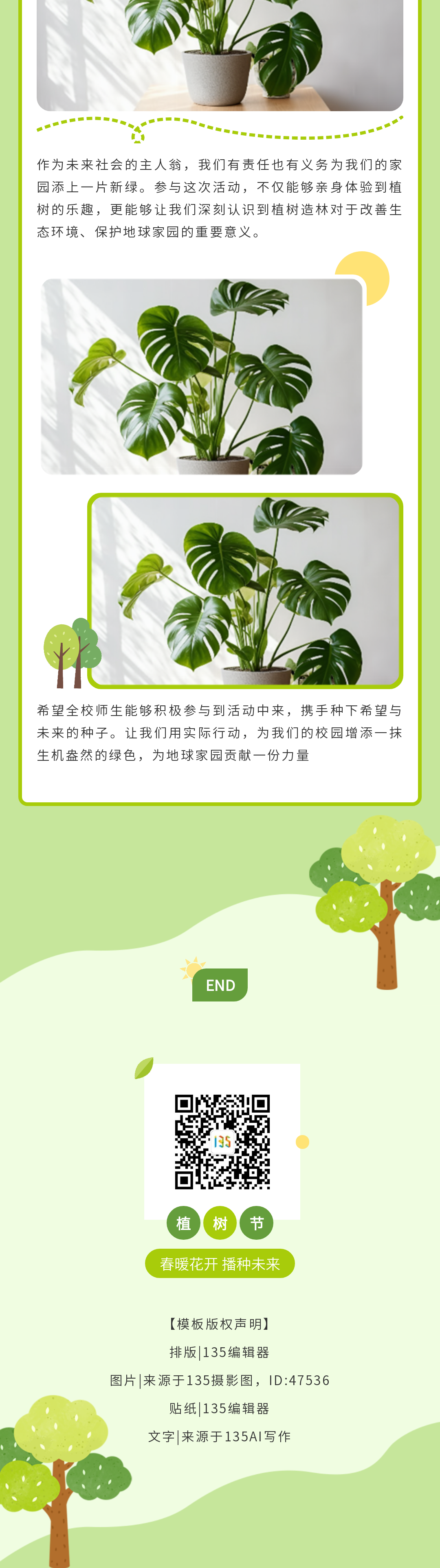 【135編輯器】提供2025最新植樹節(jié)公眾號模板、海報設(shè)計素材及公眾號樣式合集,包含漸隱圖片輪播、春日植樹計劃等創(chuàng)意模板下載。輸入模板或樣式ID快速調(diào)用。立即獲取植樹節(jié)專屬設(shè)計素材,助力綠色宣傳!