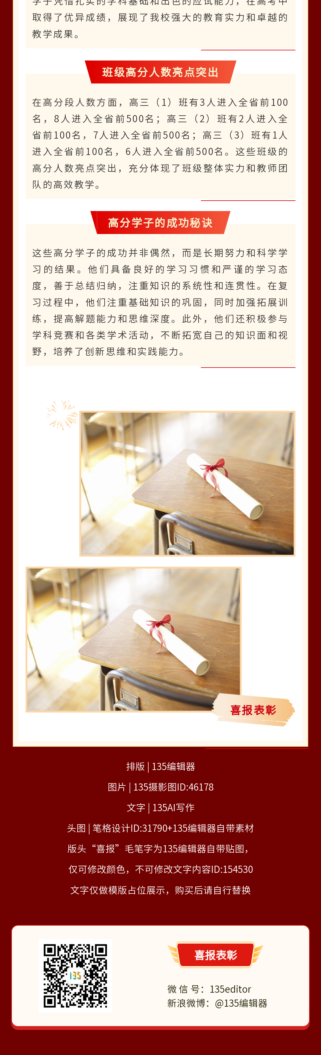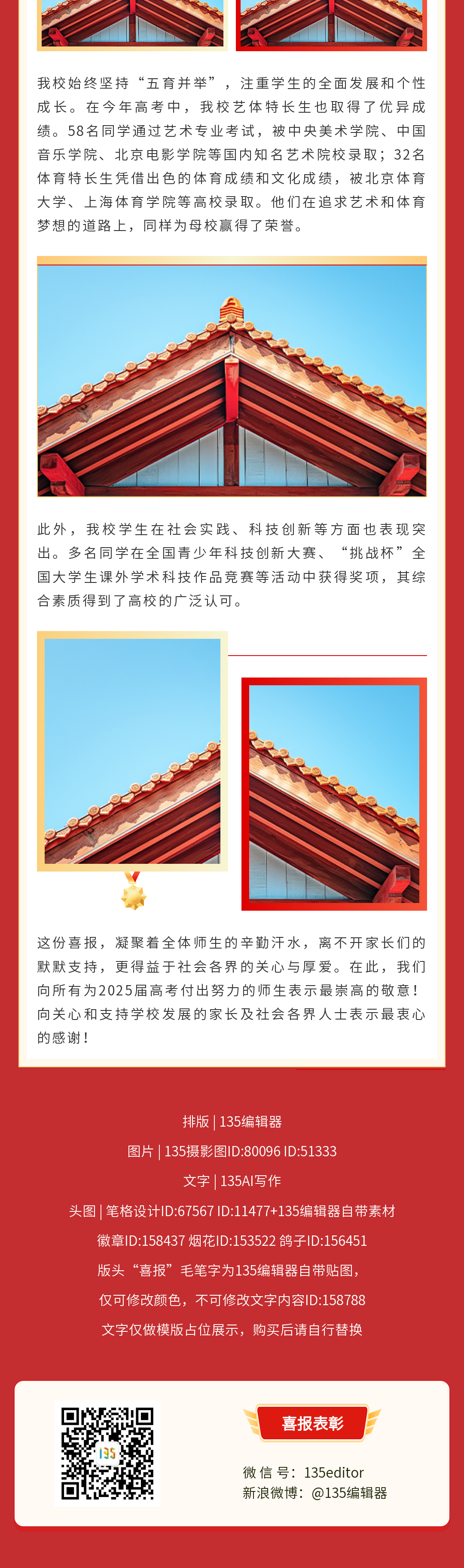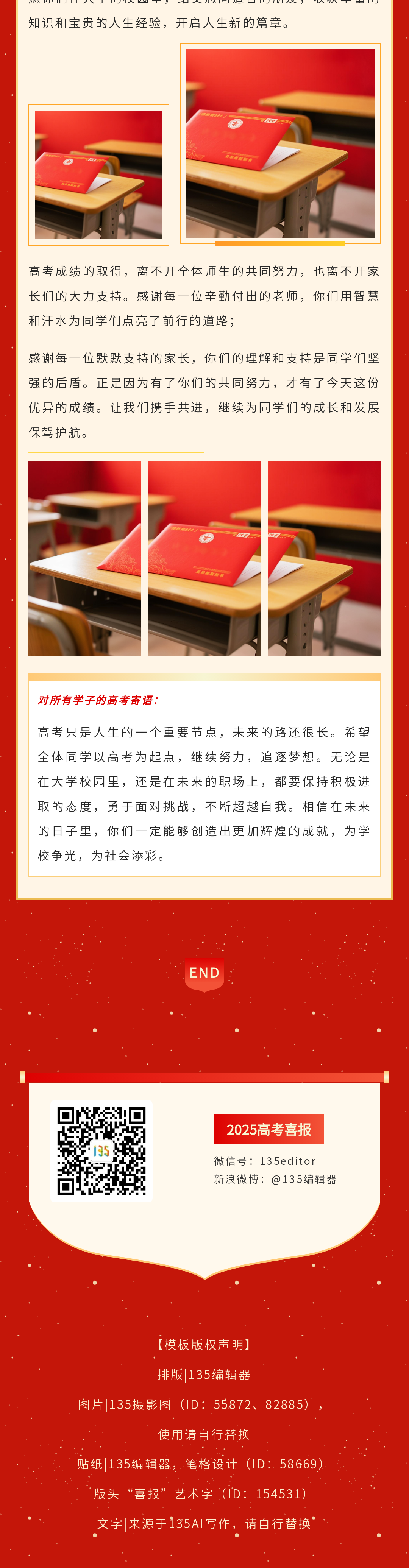 2025高考成績發(fā)布季,需要制作精美喜報(bào)?135編輯器提供多款【高考喜報(bào)公眾號(hào)推文模板】免費(fèi)下載!包含賀信、光榮榜、成績展示等多種樣式,輕松排版,助力學(xué)校/機(jī)構(gòu)快速發(fā)布喜訊。立即獲取