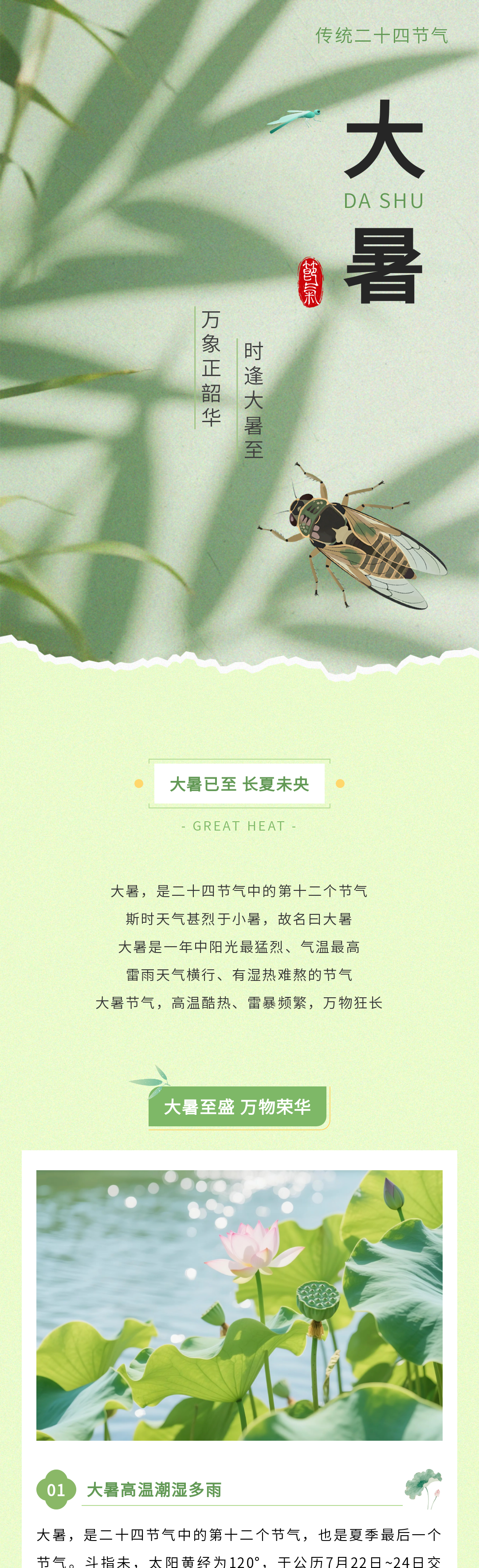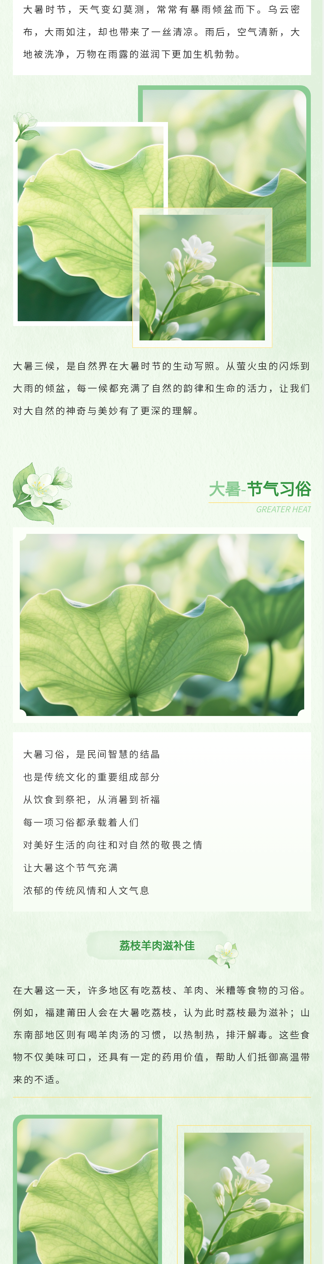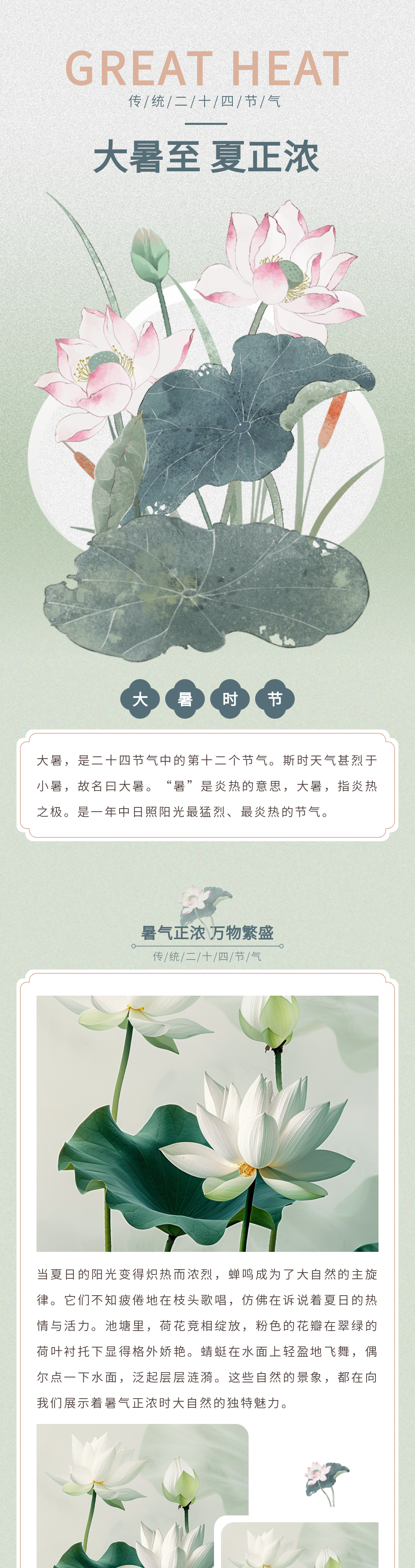 探索傳統(tǒng)二十四節(jié)氣大暑的魅力,獲取人民日?qǐng)?bào)筆下的大暑詩(shī)意描述。在135編輯器中利用精選大暑模板,輕松打造精美排版,展現(xiàn)夏季最后一個(gè)節(jié)氣的特色與美好。
