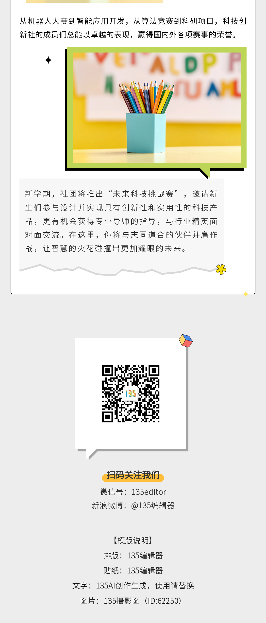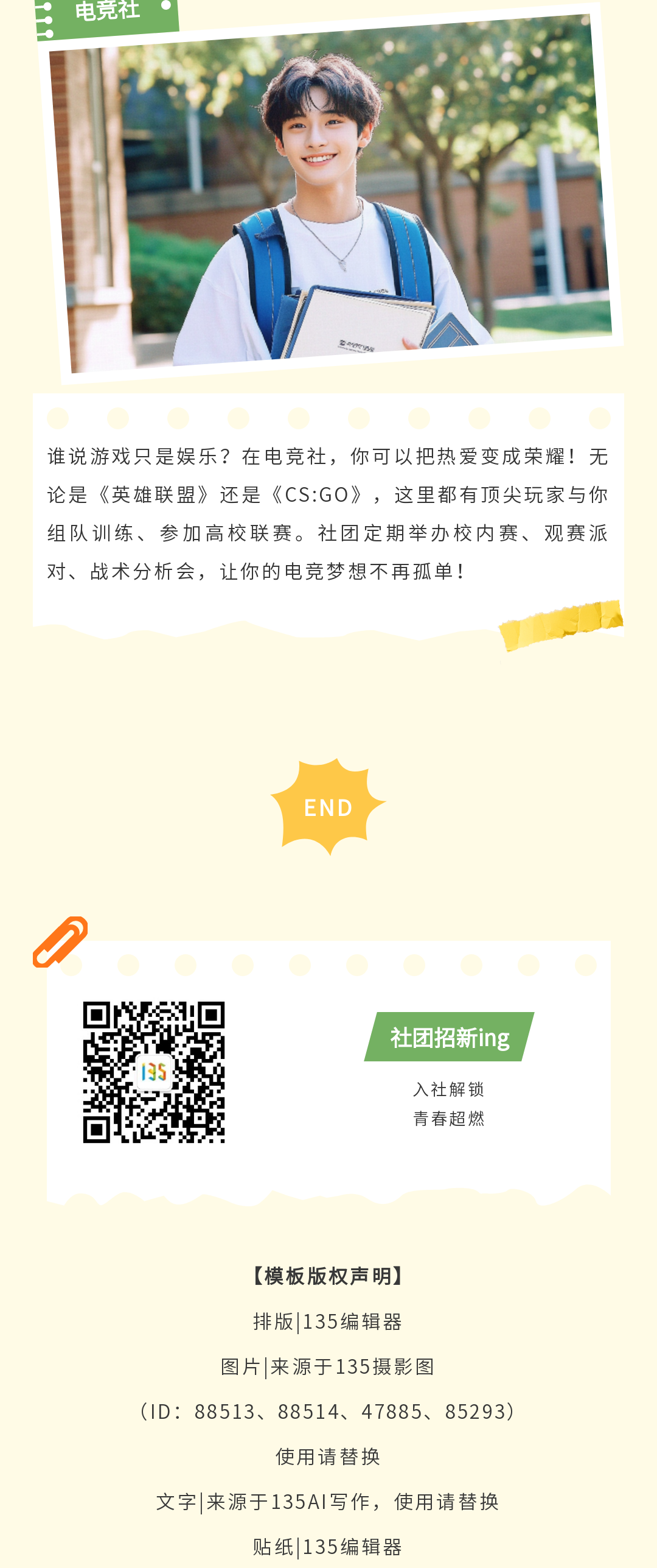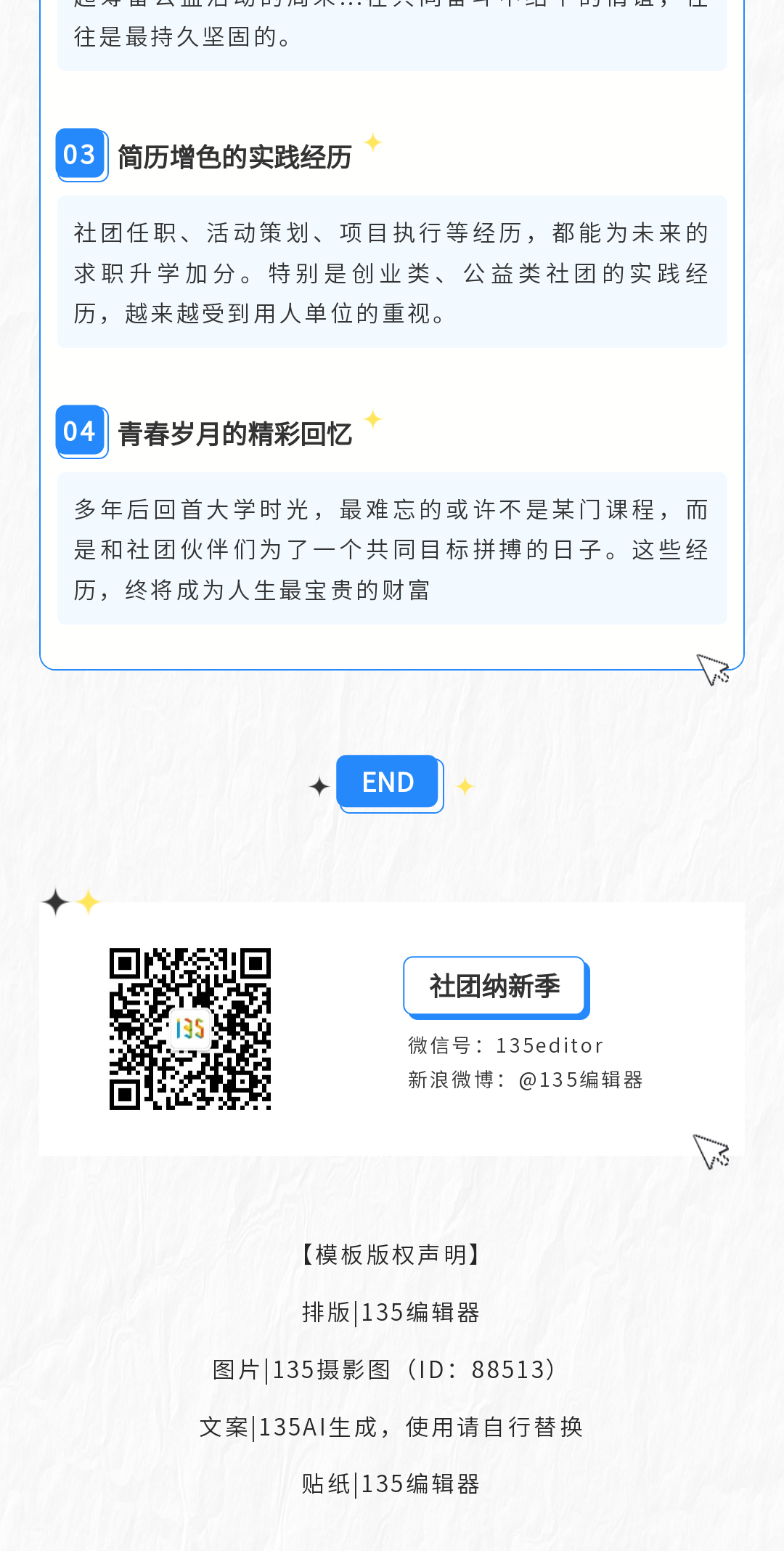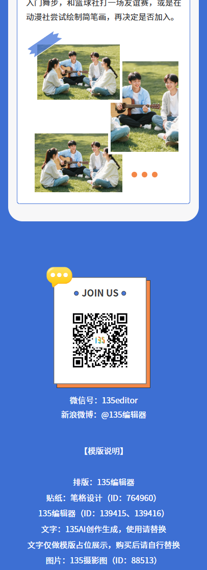 精選公眾號(hào)社團(tuán)招新模板,包含10+海報(bào)模板ID及135編輯器使用教程,幫你快速制作吸睛宣傳內(nèi)容,有效提升社團(tuán)招新效率。