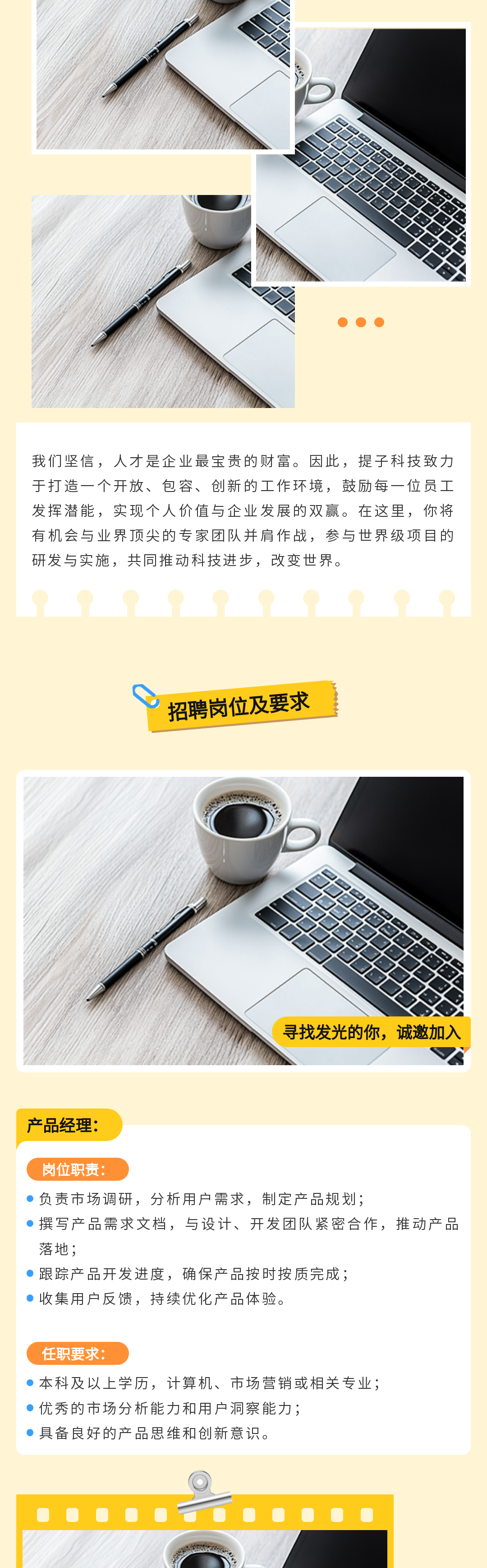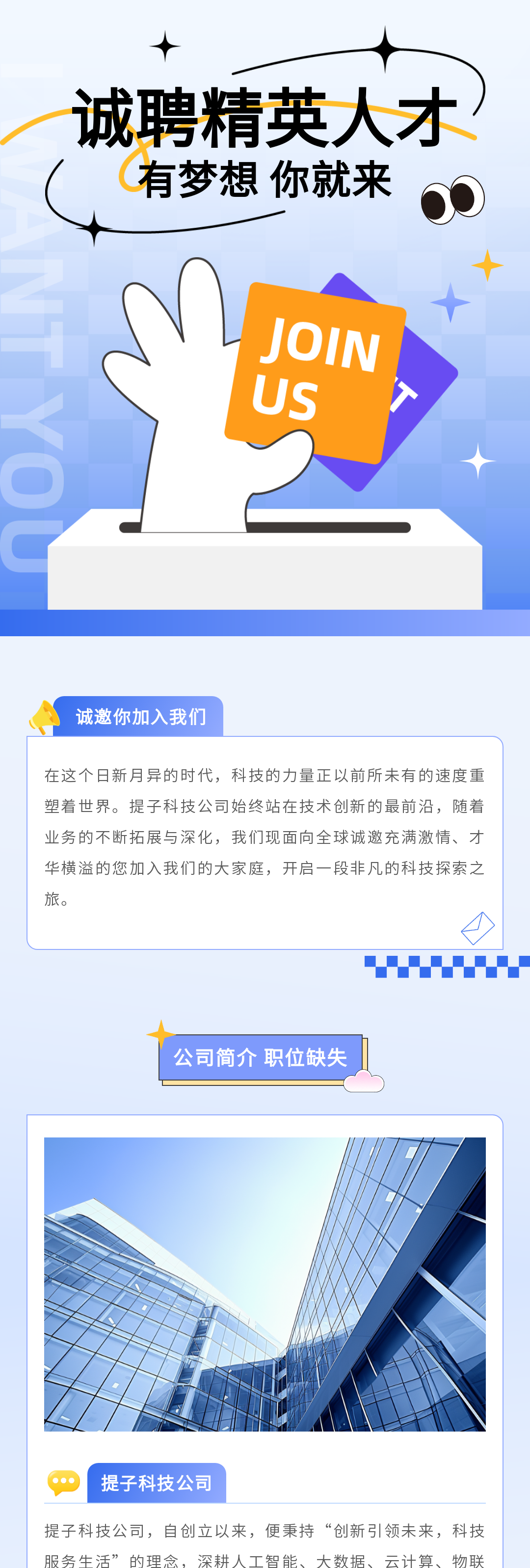 我們將在面試結(jié)束后的一周內(nèi)對(duì)您的表現(xiàn)進(jìn)行綜合評(píng)估,做出錄用決策。如果您通過了面試,我們將以郵件和電話的方式向您發(fā)送錄用通知,恭喜您即將成為提子科技大家庭的一員!