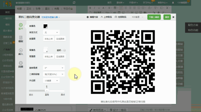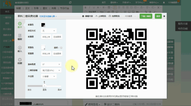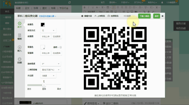 在135編輯器的設(shè)計(jì)二維碼工具中,調(diào)整二維碼參數(shù),優(yōu)化二維碼界面。主要調(diào)整:二維碼容錯(cuò)、外邊距。