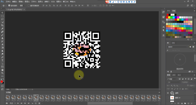 拖拽幀位置,點(diǎn)擊GIF播放按鈕,試看完成的GIF播放效果。此時(shí)也要檢查置入的二維碼圖片是否是最后一幀或最上一圖層。