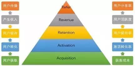 Acquisition、Activation、Retention、Revenue、Refer,這個五個單詞的縮寫,分別對應(yīng)這一款移動應(yīng)用生命周期中的5個重要環(huán)節(jié)。
