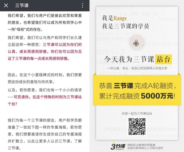 3.27日,三節(jié)課完成了A輪融資,累計完成融資5000萬元。于是它當天發(fā)了一條推送,希望學員們?yōu)槿?jié)課站臺,結果當天看到朋友圈黃燦燦的一片,都是三節(jié)課以前或者當前學員為三節(jié)課站臺的海報。