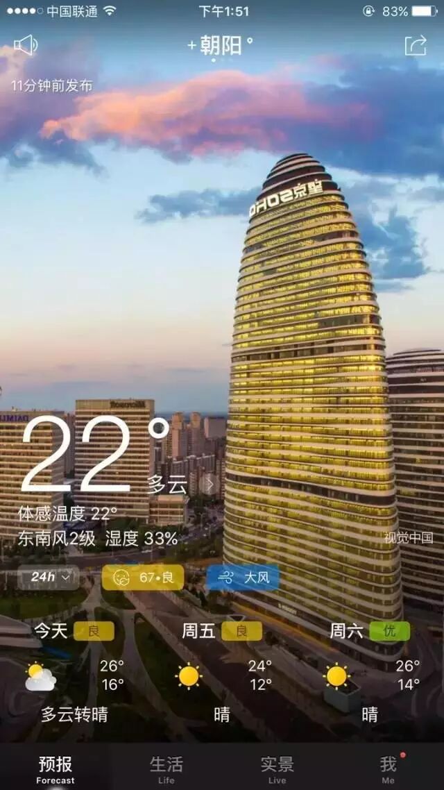 天氣通的背景圖片都很美,而且可以根據(jù)用戶所在的地理位置,展現(xiàn)附近的標(biāo)志性建筑。