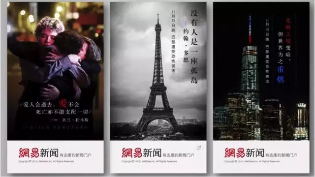 這是在面對「巴黎恐怖襲擊」這樣的大事件時(shí),網(wǎng)易新聞做出的響應(yīng)。以人文關(guān)懷的角度,去傳遞產(chǎn)品的品牌形象。