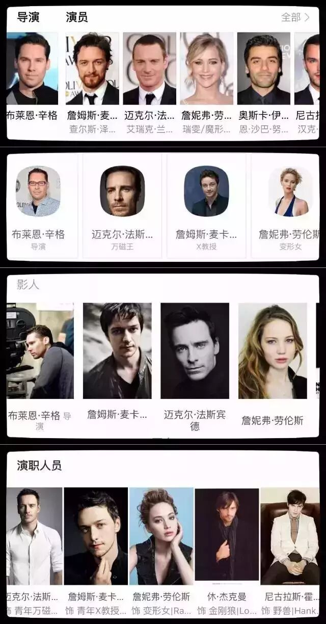電影類APP的電影信息可以通過抓取或合作引入,但要做到專業(yè)、規(guī)范、有特色,就一定要通過運(yùn)營的加工。下圖是《X戰(zhàn)警》在四個(gè)電影APP中的演員列表,對比視角效果,可以明顯看出第一個(gè)更規(guī)范更整齊,整體效果最好。再看其他三個(gè),有半身照也有大頭照,而且面部在照片中的位置有高有低,這樣就顯得很亂。