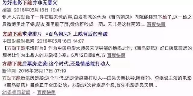 當(dāng)時(shí)在電影圈里有一個(gè)熱點(diǎn)事件,《百鳥朝鳳》的制片人方勵(lì)下跪求支持。這件事極具爭議,有很多不同的聲音。作為運(yùn)營,怎么看待這件事,就決定了采取什么樣角度和運(yùn)營措施。畢竟在此之前,并沒有對應(yīng)的方法論教你如何應(yīng)對,沒有匹配的案例去效仿。