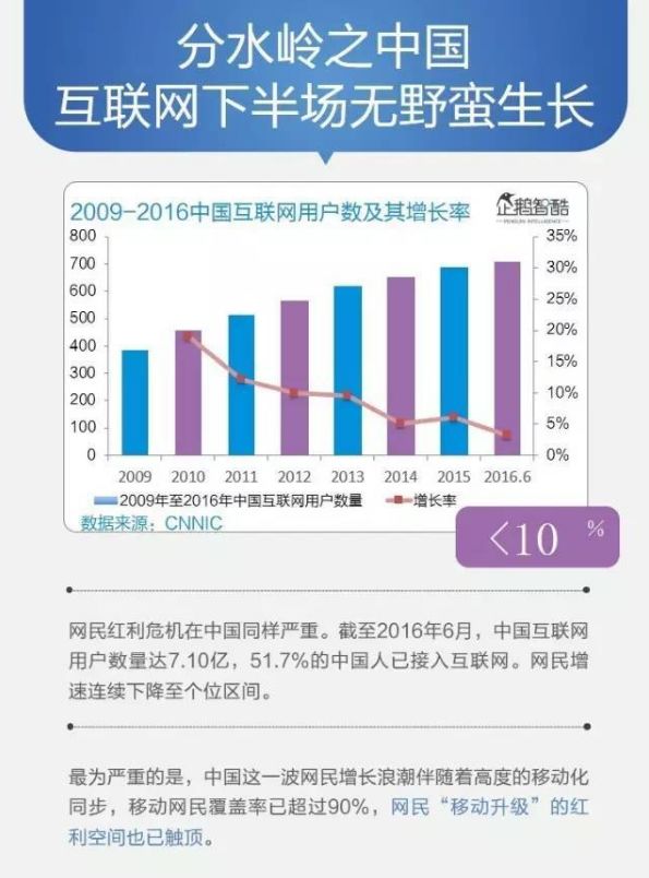 從企鵝智酷 2017 年發(fā)布的《中國互聯(lián)網(wǎng)未來 5 年趨勢白皮書》可以看到,早在 2016 年,移動網(wǎng)民的覆蓋率已經(jīng)超過 90%,網(wǎng)紅“移動升級”的紅利空間幾乎觸頂?;ヂ?lián)網(wǎng)進(jìn)入下半場,從增量市場轉(zhuǎn)換為存量市場。