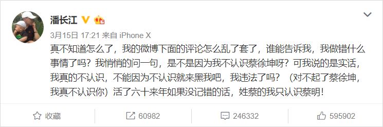 前段時(shí)間,潘長(zhǎng)江因?yàn)闆](méi)有在《王牌對(duì)王牌》的節(jié)目上認(rèn)出蔡徐坤被網(wǎng)友攻陷,一片羞辱謾罵。潘長(zhǎng)江因此發(fā)了微博。
