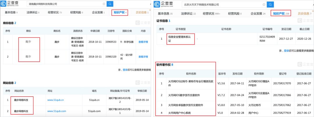 左 趣步的知識(shí)產(chǎn)權(quán),右 火幣網(wǎng)的知識(shí)產(chǎn)權(quán)