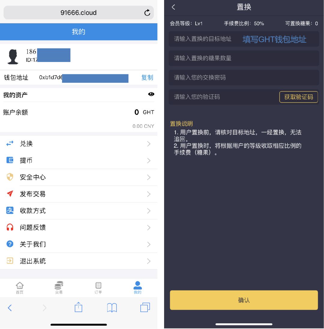原來(lái),在 GHT 里面也有一個(gè)錢(qián)包地址,在 App 的糖果置換頁(yè)面中,把錢(qián)包地址填進(jìn)去,就可以成功將糖果置換為 GHT。怎么有一種洗錢(qián)的既視感啊?