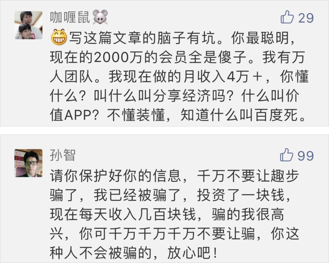 比如,他們?cè)诟鞔笃脚_(tái)發(fā)標(biāo)題類(lèi)似“趣步傳銷(xiāo)”的文章,吸引路人,然后內(nèi)容都是說(shuō)趣步怎么怎么好。