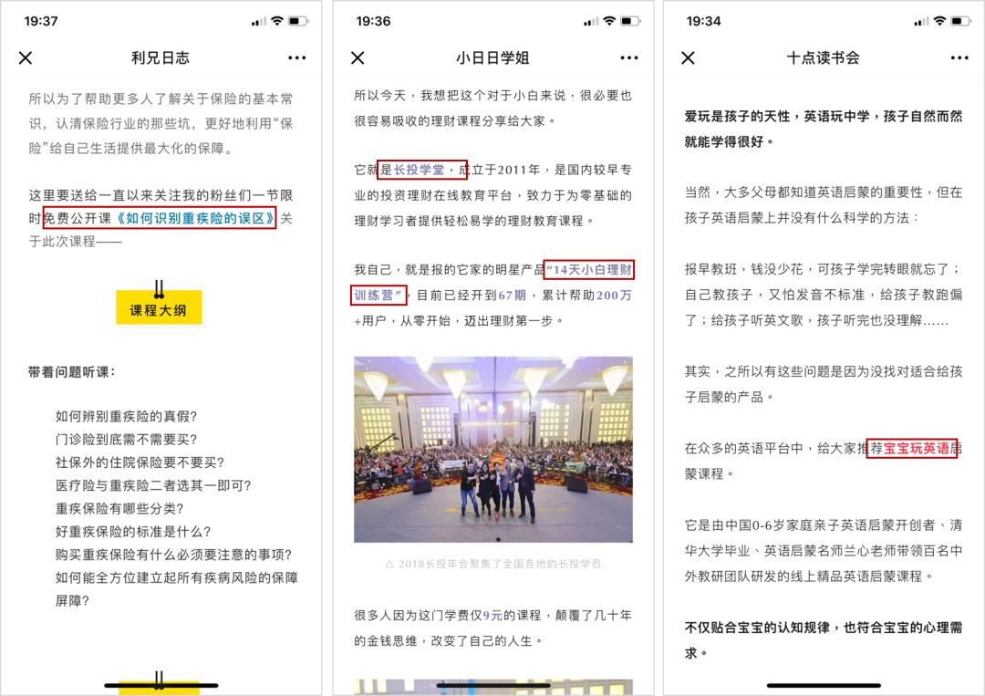 比如「蝸牛保險」、「寶寶玩英語」、「長投學堂」,都是以軟文的形式戳中目標用戶的需求,然后用免費或 10 元以下付費門檻社群吸引這部分用戶。