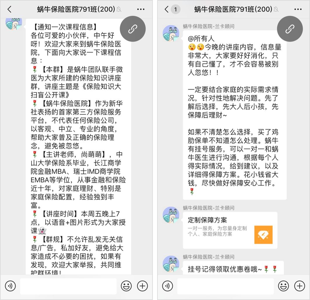 直到講座結束之后,管理員才會提醒大家他們有掛號服務(幫用戶定制保險方案),自己如果不清楚怎么選擇保險,可以購買保險定制方案,顯得非常貼心。