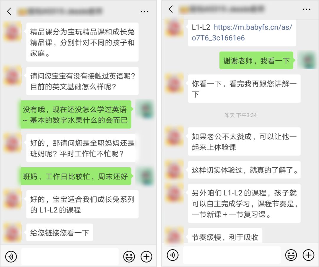 這一點「寶寶玩英語」就做得非常到位。在跟用戶溝通課程時,課程老師會對課程進行基本的介紹,通過了解家長的時間和孩子的英語水平,推薦合適的課程。