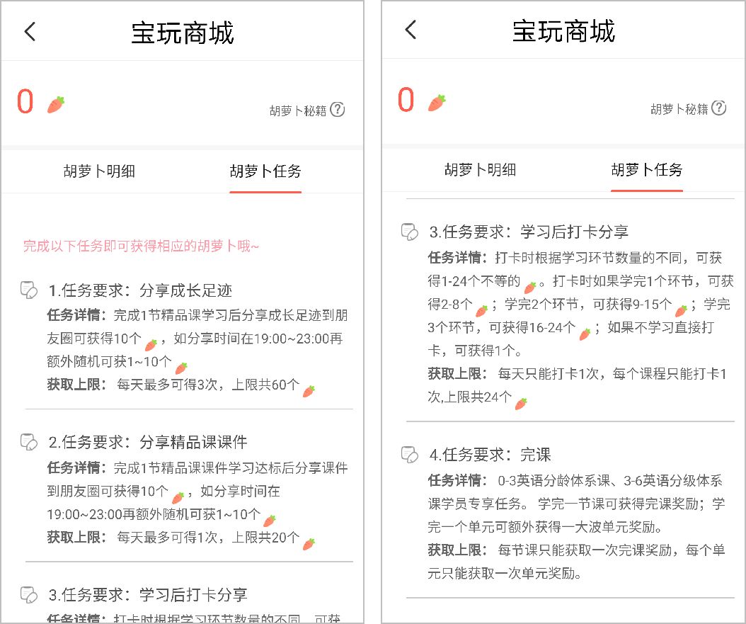 對于寶寶玩英語來說,核心目標就是拉新。因此,我們可以看到,用戶獲得「胡蘿卜」的主要方式就是分享打卡,分別是學習打卡,課件打卡和分享成長足跡。