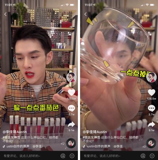 而且,動態(tài)的視覺體驗,還可以更直接地展示產品效果,增強產品的說服力。在上一節(jié)我們也提到了,這是李佳琦口紅視頻的包裝方法之一。