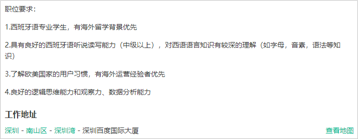 比如,以下為百度招聘海外運(yùn)營的需求,明確提出西班牙語聽說讀寫的等級,甚至詳細(xì)到字母、因素、語法等細(xì)節(jié)。