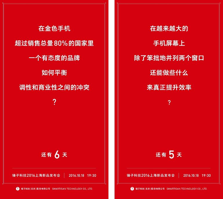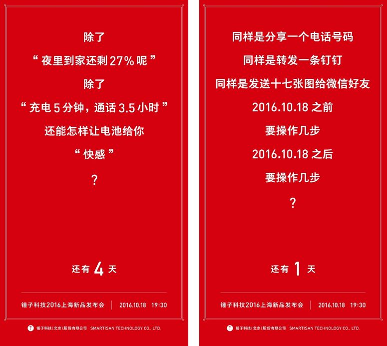 錘子發(fā)布會(huì)之前,最經(jīng)典的物料就是倒計(jì)時(shí)海報(bào),每天一張,每張的話題都不一樣,將手機(jī)賣點(diǎn)用反問(wèn)的形式進(jìn)行表達(dá),比如: